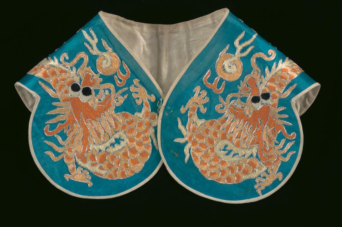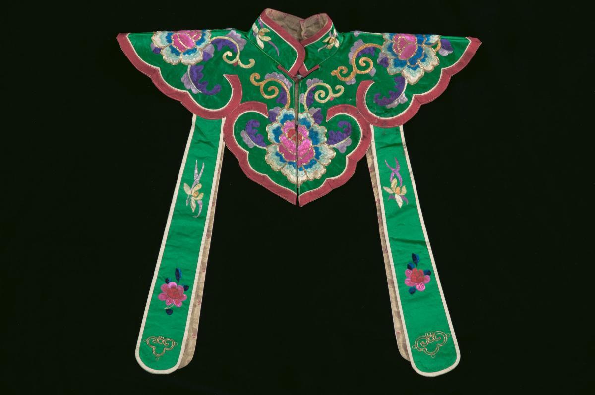 A orange shoulder piece with floral embroidery worn in a Chinese opera