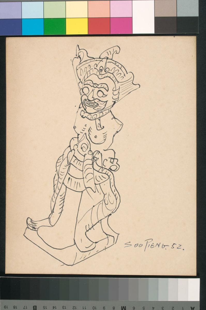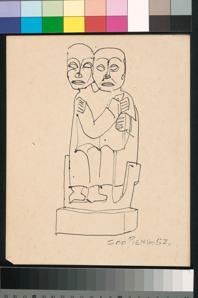 Cheong Soo Pieng is regarded as a pivotal figure in Singapore’s modern art development. Born in Xiamen (Amoy), China in 1914, he was part of a group of artists that attempted to articulate a style identifiable and pertinent to post-war Singapore, then known collectively with Malaysia, as Malaya. This style, later crystallized as the Nanyang Style, provided a foundation upon which future generations of artists learned and expanded on. Cheong’s art is also closely linked with his travels–the much-heralded Bali trip (1952), Sarawak (1959), London and Europe (1961-1963). These sojourns not only provided inspiration but also consolidated his worldview in art-making.Cheong’s visit to Bali in 1952 and his sojourn there brought him into close contact with the various indigenous communities. This drawing shows one of the many artefacts that he could have seen. Like many of the Western artists including Picasso, Matisse and Gauguin who were inspired by art from the African tribes, Cheong’s interaction with these communities provided new impetus for his future works.
