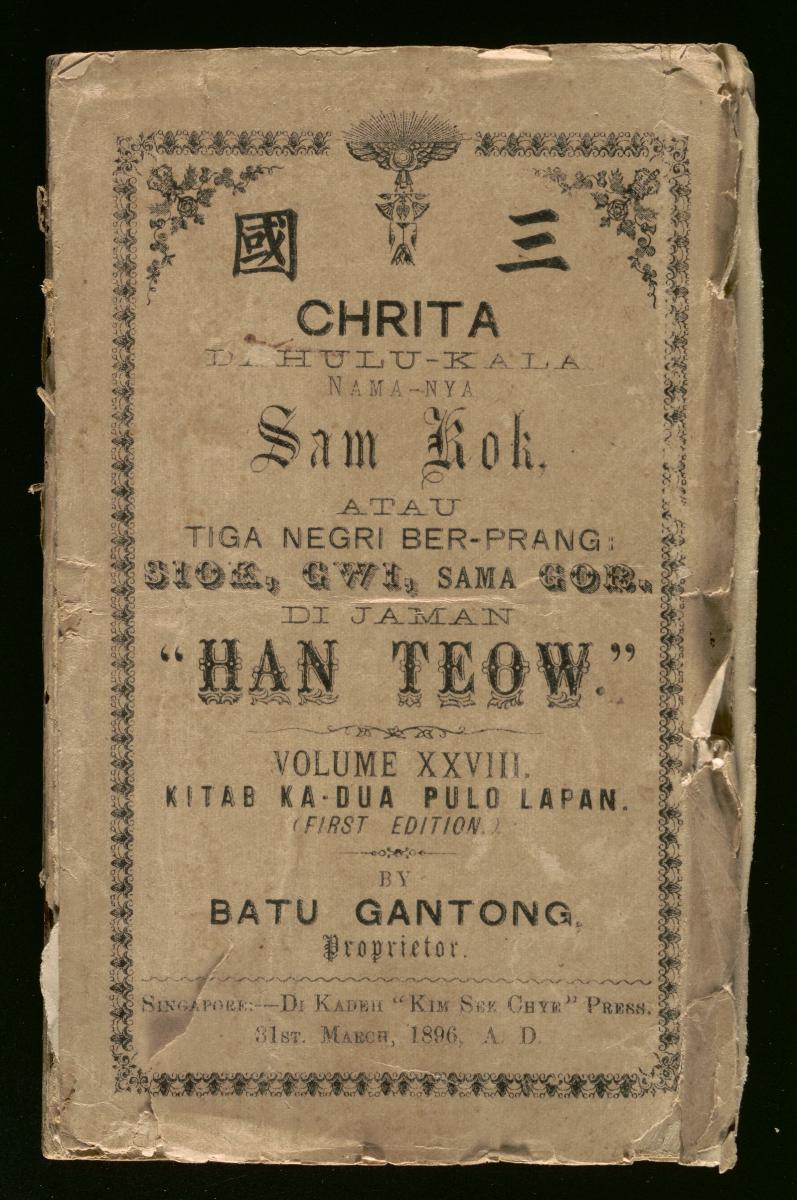 This is an example of “Chrita Dulu Kala” which is loosely translated as “stories from ancient times”. They were usually storybooks of the traditional Chinese classics that were translated from Chinese to Baba Malay. These tales of Chinese folklore, legends and historical epics include famous novels such as “Romance of the Three Kingdoms” and “Water Margin”. Although most of these works appeared in paperback form, it was possible that a few volumes could be combined to form a specially bound copy, such as this one. “Chrita Dulu Kala” were traditionally read by Peranakan men. Many elderly Peranakan ladies today remember being told stories from these books by their fathers, uncles and grandfathers. Many of the Chinese traditions of the Peranakan Chinese are believed to have been transmitted via these storybooks. This book is the first volume of the series entitled “Hong Sin”.