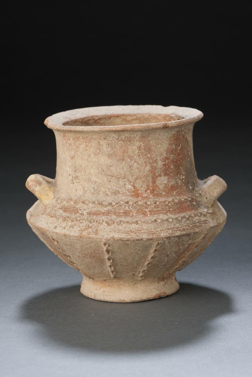 This large round-bottomed jar was made by coiling and paddle-beating the walls. The uneven shape resulted from warping during firing. It has four lug handles and impressed leaf-shaped motifs with elephants around the shoulder covered with a thin runny brown glaze. Although not made as export wares, at least one example has beeen found in Java. Active trade took place during the Majapahit period bewteen Lower Burma and Java and it is quite possible that the kilns at Twante, which are known to have produced stamped wares, made jars such as this.