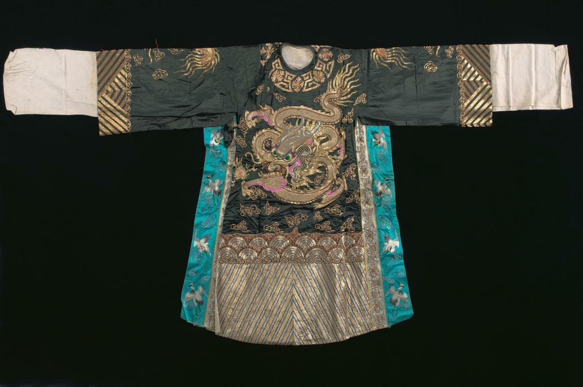 A black robe with sequined dragon motifs worn by a court official in a Chinese opera