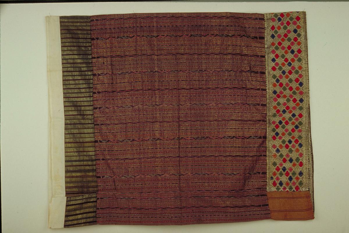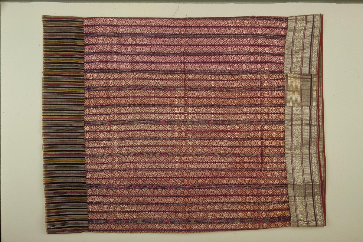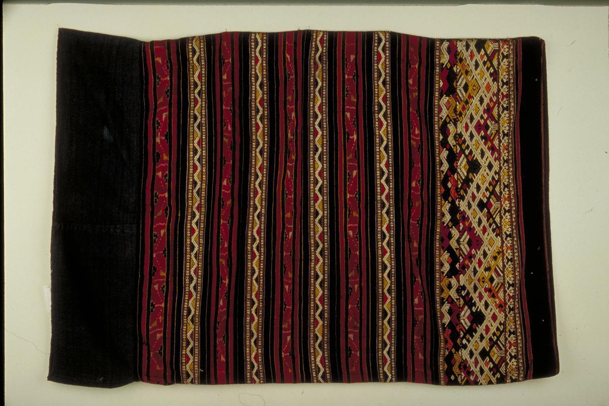 This tubeskirt has a mix of indigo and maroon-deyed warp and weft, as well as supplementary woven bands in red, yellow, white and green. The bands comprise rows of what appear to be a variation of the 8-pointed star motif that is found in many of the Tai textile traditions in mainland Southeast Asia.The skirt was probably made by a Tai Daeng weaver. The mix of indigo and maroon threads for the ground is typical of the Tai Daeng weaving tradition.
