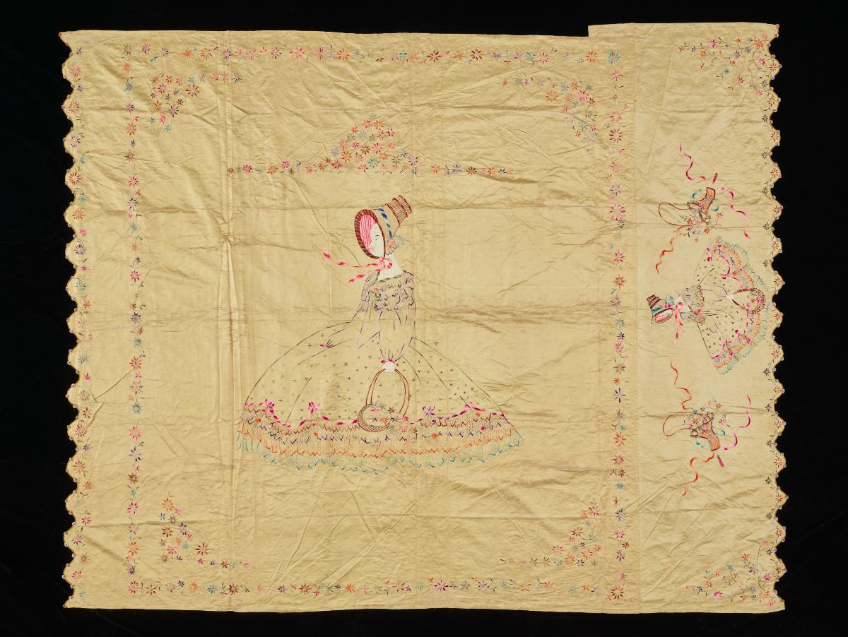 The decorative motifs on this bed cover include embroidered peony flowers and phoenix motifs. Peonies symbolise spring, love, beauty and good fortune while the phoenix can represent beauty, grace, high virtue, the Empress and the bride. The auspicious symbols suggest that it was possibly used in wedding ceremonies, such as the drapes for the traditional wedding bed.
