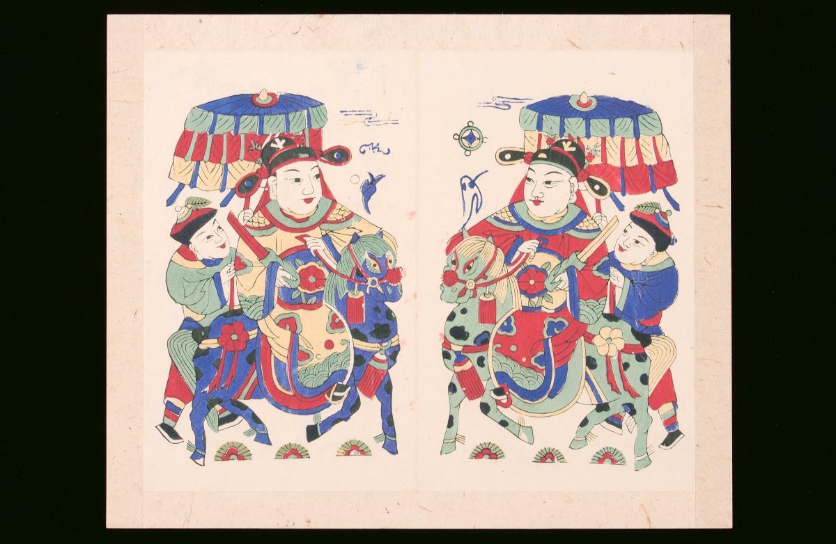 Chinese woodblock print depicting a top scholar mounted on a horse with attendant under seal prints containing wishes for the new year