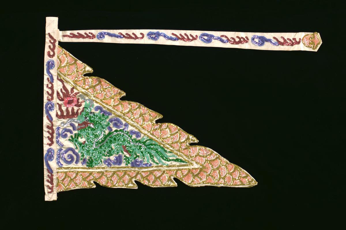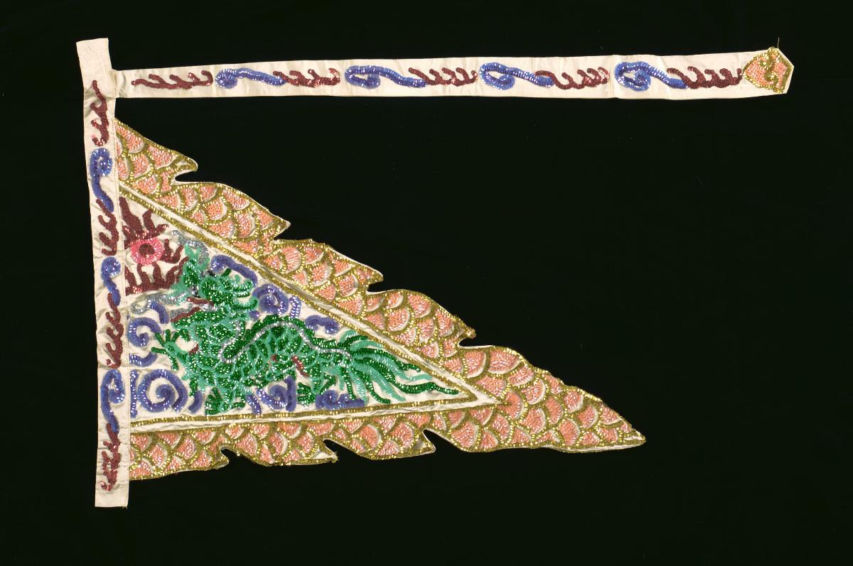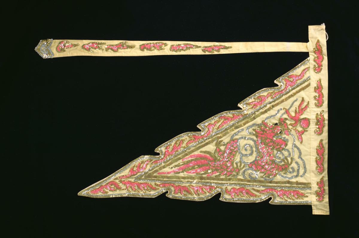 A triangular pennant with a sequined dragon motif worn by a ‘wu sheng’ in a Chinese opera
