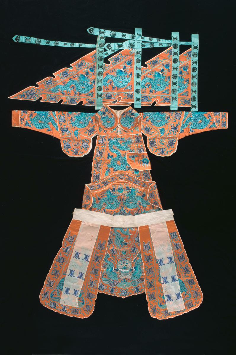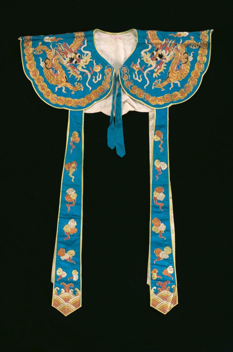 An orange shoulder piece embroidered with blue dragon motifs worn by a ‘wu sheng’ in a Chinese opera