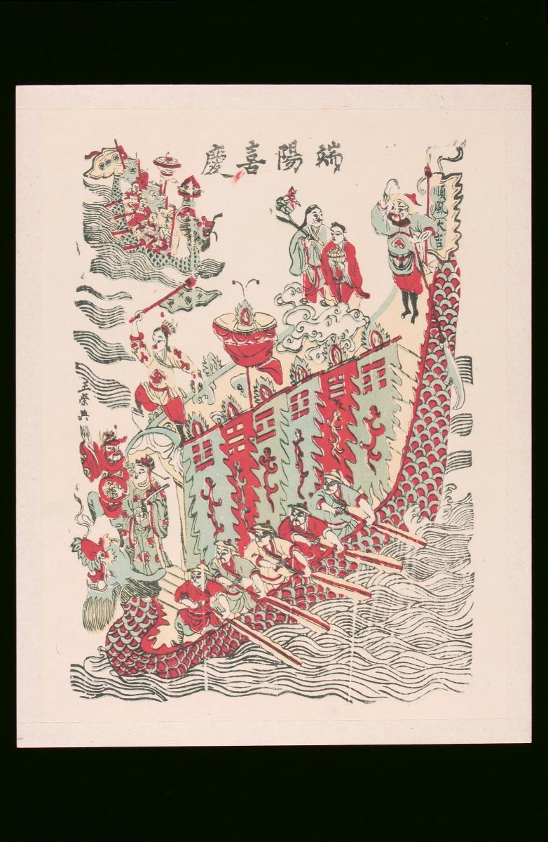 Chinese woodblock print depicting celebrations during the Dragon Boat Festival (端午节) under seal prints containing wishes for the new year
