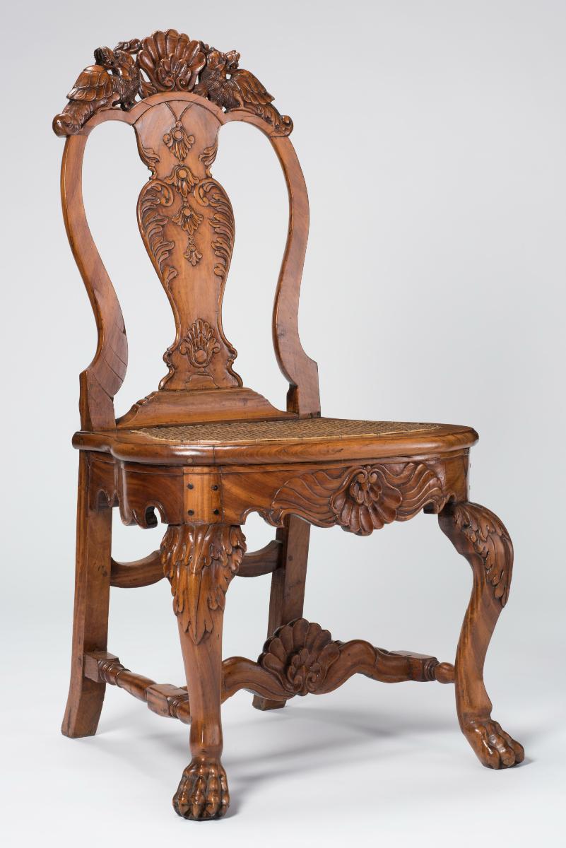 This three seater settee is an example of European style furniture favoured by the Peranakan communities. Such furniture was usually made locally out of teak, which was readily available in Southeast Asia. This taste for European style furniture was in line with the prevailing fashion for such furniture in the Straits Settlements from the late 19th century onwards. This piece takes after the Chippendale style in terms of its pierced splat backs, scrolling foliage and cabriole legs. However, unlike the Chippendale chairs, they have cane seats (useful for humid tropical weather) instead of upholstered seats. Most Chippendale chairs do not have armrests but Peranakan versions of such chairs usually do, as they were meant mainly as hallway furniture rather than as dining furniture.