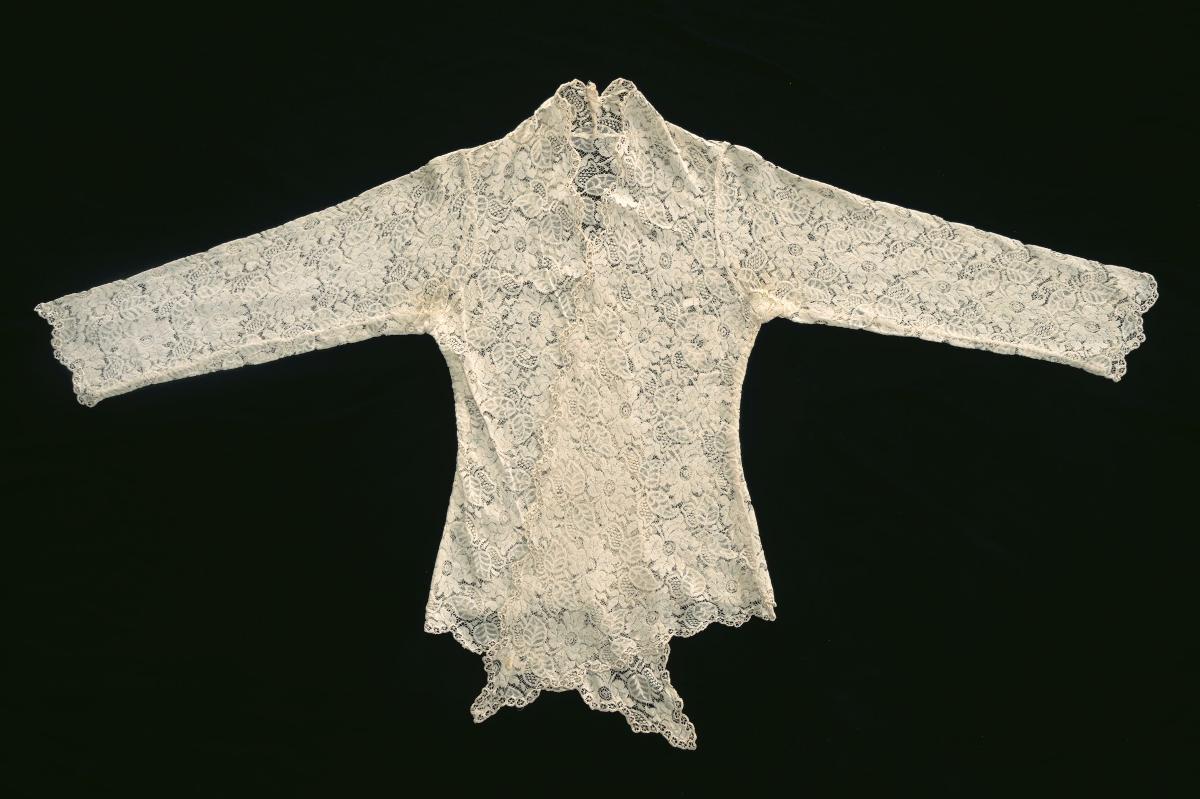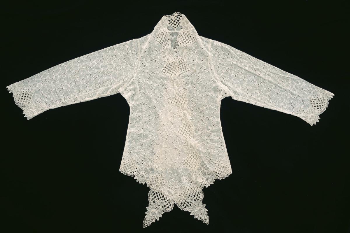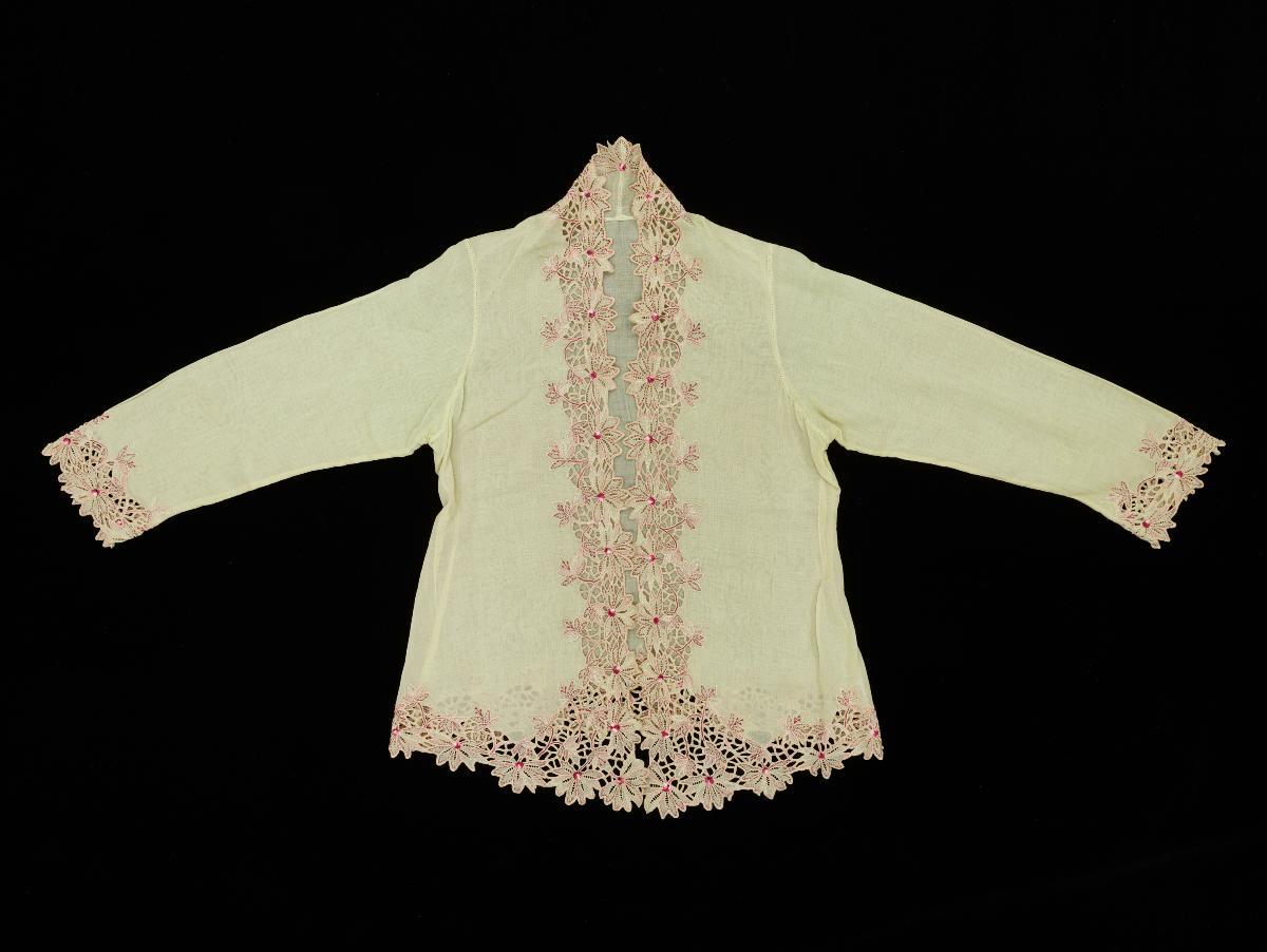 This is a piece of cotton cloth consisting of various shades of red and green. The decorative motifs are made up of flowers and cranes. The crane is a graceful bird that symbolises status and longevity. It is the second most important bird in the Chinese legend after the phoenix. This cloth could have been used to wrap and protect white lace kebayas from discolouration and infestation when they were not being worn. Textiles such as kebayas were susceptible to attacks from various kinds of insects which fed on the organic material, thus destroying or damaging the original textile.