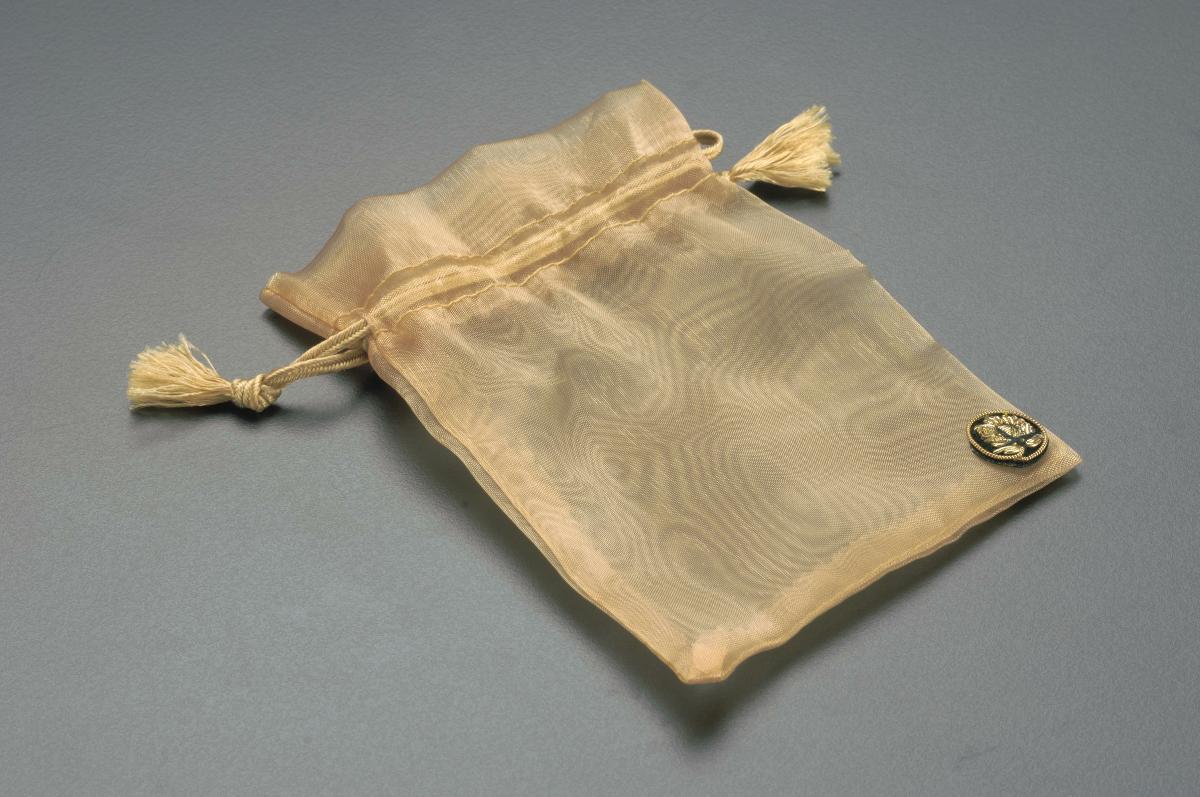 This organza drawstring pouch comes with this charm bracelet (2009-03716).The charm bracelet is made of ebony beads. Attached to it is a gold pendant with full cut diamonds. The pendant is shaped like a snake, one of the twelve Chinese zodiac animals. The bracelet is part of the Kismet Collection from the jewellery company, Lotus Arts de Vivre, which is based in Bangkok, Thailand.