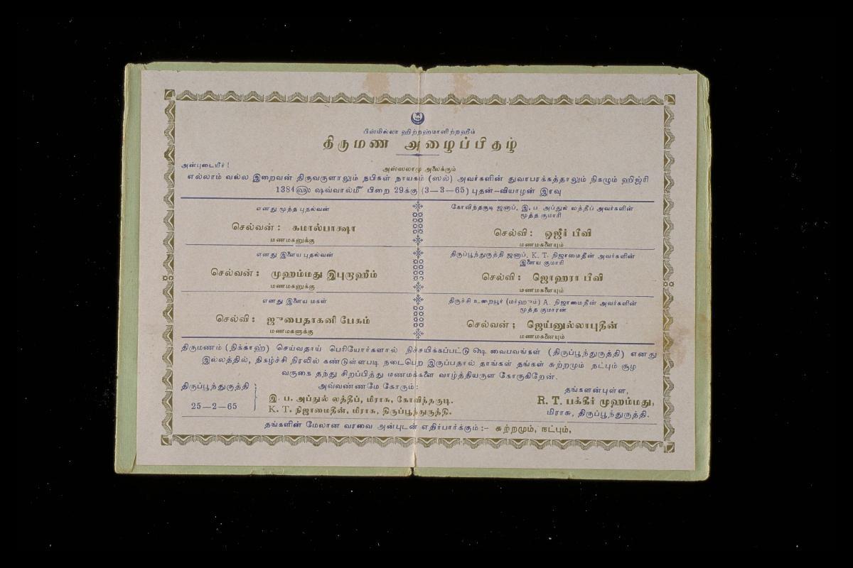 Chitty, also known as Indian Peranakans, is a distinctive group of Tamil people found mainly in Malacca and Singapore. Like other groups of Peranakans, the Chitty speak a Malay Patois, which is mixed with many Tamil loan words. The wedding invite here is historically significant, marking an important occasion in the community's life and is dated to the short time frame of the Second World War when Singapore was referred to as "Syonan". The dating follows the Japanese system, which is based on the years that the Emperor has been on the throne.