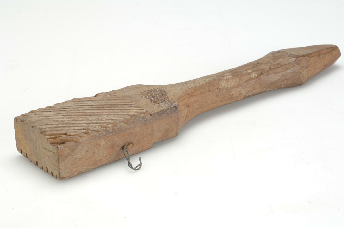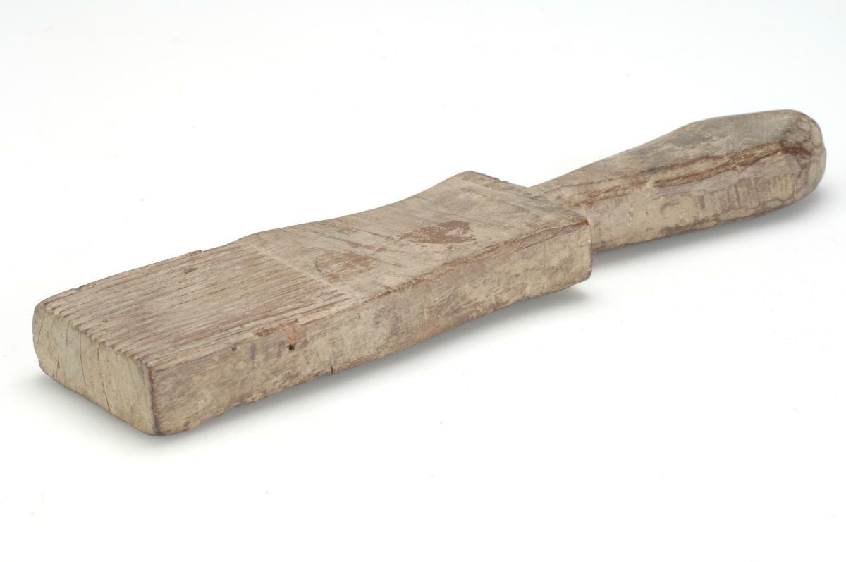 This large red circular stamp with handle is decorated with spiral motif. Clay stamps were often found with grave goods of the Later Ban Chiang Period. While there is little evidence for their function, it has been suggested they were used to apply decoration to textiles. They were probably dipped in dye in order to transfer the design.The site of Ban Chiang was first discovered in 1957. Pottery was found with skeletal remains, glass beads as well as iron and bronze bracelets.