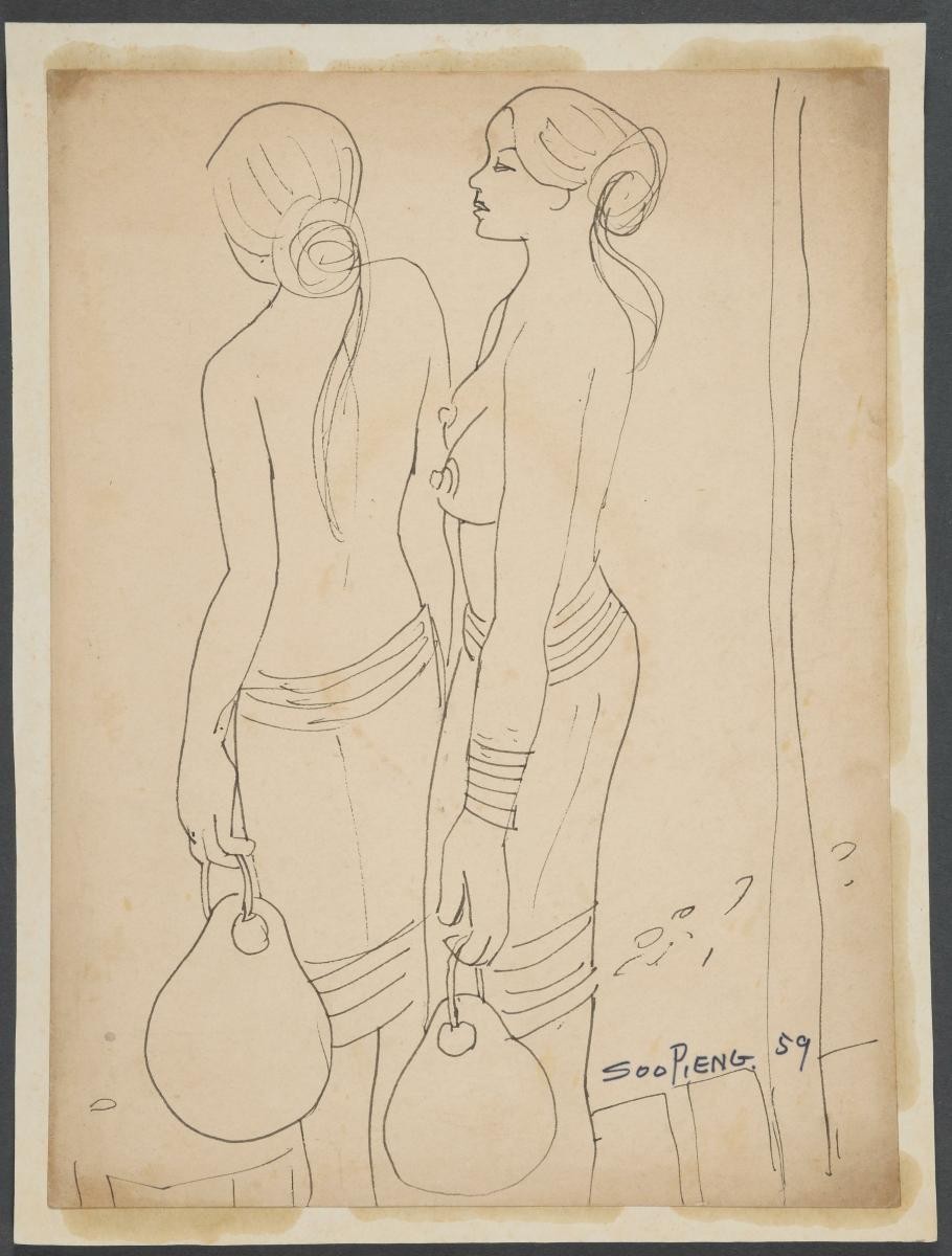 Cheong Soo Pieng, born in Xiamen (Amoy), China in 1914, was accomplished in ink painting having received training in art at Xiamen Academy of Art and Xinhua Academy of Fine Arts in Shanghai. A year after his arrival in Singapore in 1946, he started lecturing at Nanyang Academy of Fine Arts and stayed on till 1961. However it was a trip taken with fellow artists Chen Chong Swee, Chen Wen Hsi and Liu Kang in 1952 to Bali to seek inspiration and seek fresh subject matter that sealed his standing as a pivotal figure in Singapore’s modern art development. He was part of a group of artists that attempted to articulate a style identifiable and pertinent to post-war Singapore, then known collectively with Malaysia, as Malaya. This style, later crystallized as the Nanyang style, provided a foundation upon which future generations of artists learned and expanded on. A key element of the Nanyang style is the synthesis of Chinese pictorial elements and the diverse formalistic qualities from the School of Paris. In 1962, the Singapore government awarded Cheong with the Meritorious Service Medal. He passed away in 1983.A keen observer of people, Cheong sketches the pigtails of two women in Malay dress in ‘Untitled (Two Women with Pigtails)’.