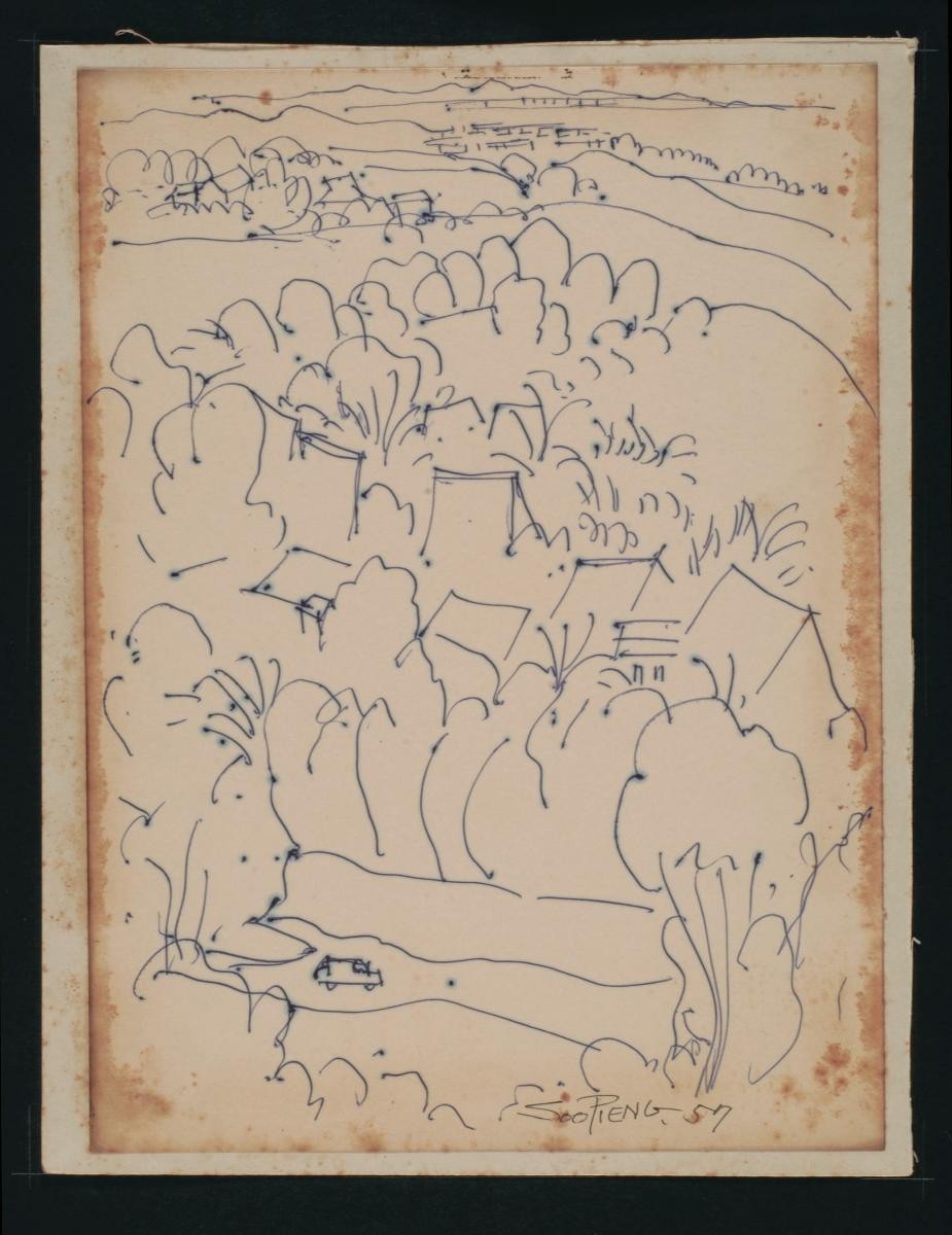 Cheong Soo Pieng, born in Xiamen (Amoy), China in 1914, was accomplished in ink painting having received training in art at Xiamen Academy of Art and Xinhua Academy of Fine Arts in Shanghai. A year after his arrival in Singapore in 1946, he started lecturing at Nanyang Academy of Fine Arts and stayed on till 1961. However it was a trip taken with fellow artists Chen Chong Swee, Chen Wen Hsi and Liu Kang in 1952 to Bali to seek inspiration and seek fresh subject matter that sealed his standing as a pivotal figure in Singapore’s modern art development. He was part of a group of artists that attempted to articulate a style identifiable and pertinent to post-war Singapore, then known collectively with Malaysia, as Malaya. This style, later crystallized as the Nanyang style, provided a foundation upon which future generations of artists learned and expanded on. A key element of the Nanyang style is the synthesis of Chinese pictorial elements and the diverse formalistic qualities from the School of Paris. In 1962, the Singapore government awarded Cheong with the Meritorious Service Medal. He passed away in 1983.‘Untitled (Returning Home)’ is one of many sketches Cheong made of villagers and their way of life during his travel around Southeast Asia that eventually informed his art and iconography.