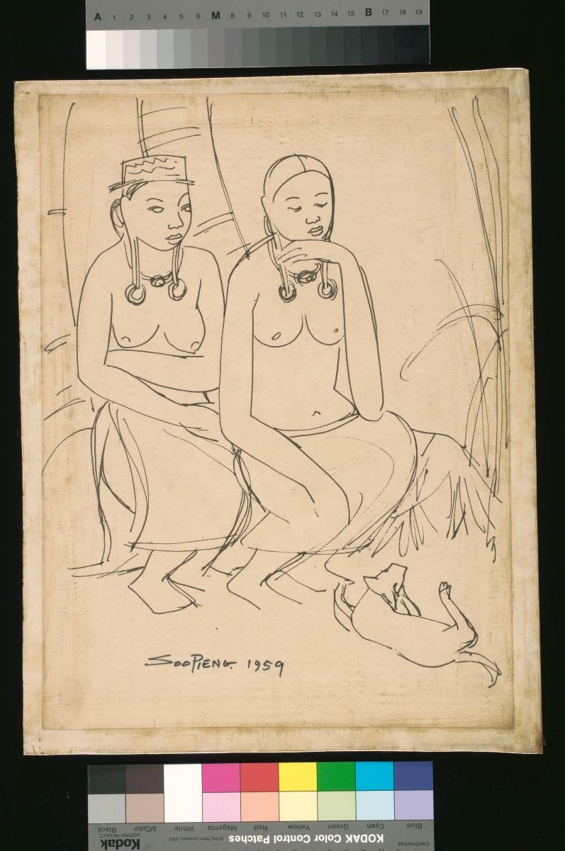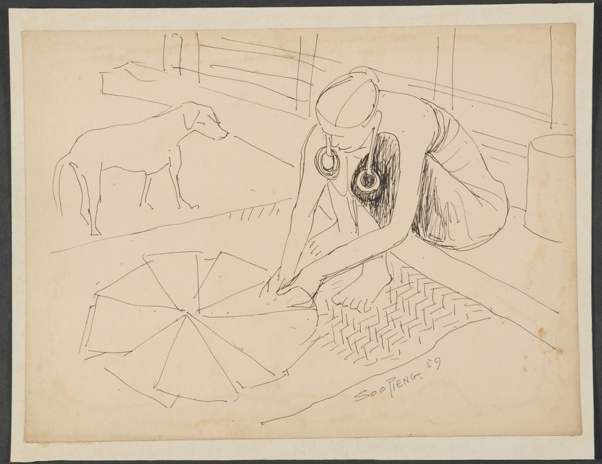 Cheong Soo Pieng, born in Xiamen (Amoy), China in 1914, was accomplished in ink painting having received training in art at Xiamen Academy of Art and Xinhua Academy of Fine Arts in Shanghai. A year after his arrival in Singapore in 1946, he started lecturing at Nanyang Academy of Fine Arts and stayed on till 1961. However it was a trip taken with fellow artists Chen Chong Swee, Chen Wen Hsi and Liu Kang in 1952 to Bali to seek inspiration and seek fresh subject matter that sealed his standing as a pivotal figure in Singapore’s modern art development. He was part of a group of artists that attempted to articulate a style identifiable and pertinent to post-war Singapore, then known collectively with Malaysia, as Malaya. This style, later crystallized as the Nanyang style, provided a foundation upon which future generations of artists learned and expanded on. A key element of the Nanyang style is the synthesis of Chinese pictorial elements and the diverse formalistic qualities from the School of Paris. In 1962, the Singapore government awarded Cheong with the Meritorious Service Medal. He passed away in 1983.‘Untitled (Dayak Mother with Child and Dog)’ is one of many sketches of the ethnic group Cheong produced during his trip to Borneo in 1959.