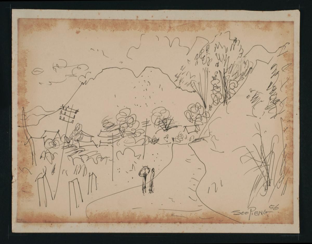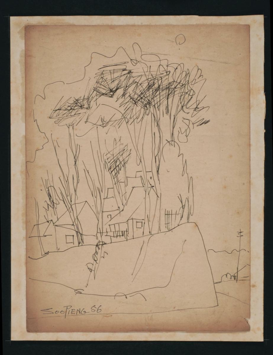 Cheong Soo Pieng, born in Xiamen (Amoy), China in 1914, was accomplished in ink painting having received training in art at Xiamen Academy of Art and Xinhua Academy of Fine Arts in Shanghai. A year after his arrival in Singapore in 1946, he started lecturing at Nanyang Academy of Fine Arts and stayed on till 1961. However it was a trip taken with fellow artists Chen Chong Swee, Chen Wen Hsi and Liu Kang in 1952 to Bali to seek inspiration and seek fresh subject matter that sealed his standing as a pivotal figure in Singapore’s modern art development. He was part of a group of artists that attempted to articulate a style identifiable and pertinent to post-war Singapore, then known collectively with Malaysia, as Malaya. This style, later crystallized as the Nanyang style, provided a foundation upon which future generations of artists learned and expanded on. A key element of the Nanyang style is the synthesis of Chinese pictorial elements and the diverse formalistic qualities from the School of Paris. In 1962, the Singapore government awarded Cheong with the Meritorious Service Medal. He passed away in 1983.‘Untitled (Overlooking the Village from A Hill)’ is an example of Cheong’s scrutiny of and interest in depicting the regional landscape. This sketch, together with countless others. provides useful entry points to understand the sources of his iconography.