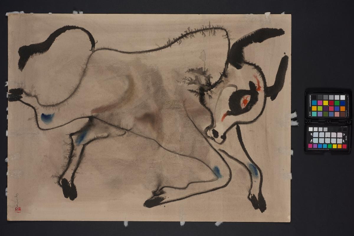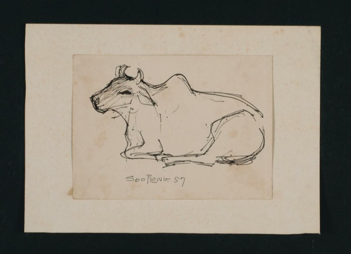 Cheong Soo Pieng, born in Xiamen (Amoy), China in 1914, was accomplished in ink painting having received training in art at Xiamen Academy of Art and Xinhua Academy of Fine Arts in Shanghai. A year after his arrival in Singapore in 1946, he started lecturing at Nanyang Academy of Fine Arts and stayed on till 1961. However it was a trip taken with fellow artists Chen Chong Swee, Chen Wen Hsi and Liu Kang in 1952 to Bali to seek inspiration and seek fresh subject matter that sealed his standing as a pivotal figure in Singapore’s modern art development. He was part of a group of artists that attempted to articulate a style identifiable and pertinent to post-war Singapore, then known collectively with Malaysia, as Malaya. This style, later crystallized as the Nanyang style, provided a foundation upon which future generations of artists learned and expanded on. A key element of the Nanyang style is the synthesis of Chinese pictorial elements and the diverse formalistic qualities from the School of Paris. In 1962, the Singapore government awarded Cheong with the Meritorious Service Medal. He passed away in 1983.'Untitled (Cart and Resting Bull)' is an example of Cheong’s scrutiny of and interest in the regional landscape.