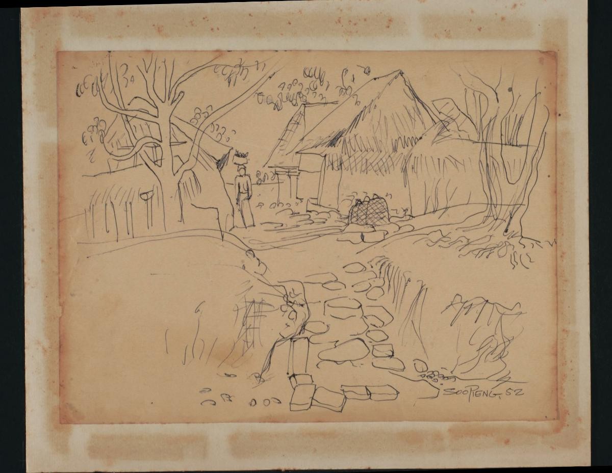 Cheong Soo Pieng, born in Xiamen (Amoy), China in 1914, was accomplished in ink painting having received training in art at Xiamen Academy of Art and Xinhua Academy of Fine Arts in Shanghai. A year after his arrival in Singapore in 1946, he started lecturing at Nanyang Academy of Fine Arts and stayed on till 1961. However it was a trip taken with fellow artists Chen Chong Swee, Chen Wen Hsi and Liu Kang in 1952 to Bali to seek inspiration and seek fresh subject matter that sealed his standing as a pivotal figure in Singapore’s modern art development. He was part of a group of artists that attempted to articulate a style identifiable and pertinent to post-war Singapore, then known collectively with Malaysia, as Malaya. This style, later crystallized as the Nanyang style, provided a foundation upon which future generations of artists learned and expanded on. A key element of the Nanyang style is the synthesis of Chinese pictorial elements and the diverse formalistic qualities from the School of Paris. In 1962, the Singapore government awarded Cheong with the Meritorious Service Medal. He passed away in 1983.‘Untitled (A Village Scene)’ is a reflection of the ‘localness of the place’, a theme that resonates strongly in Cheong’s art. This is one of countless sketches he made of the people and landscape of Southeast Asia which collectively provide useful entry points to understand the sources of his iconography.