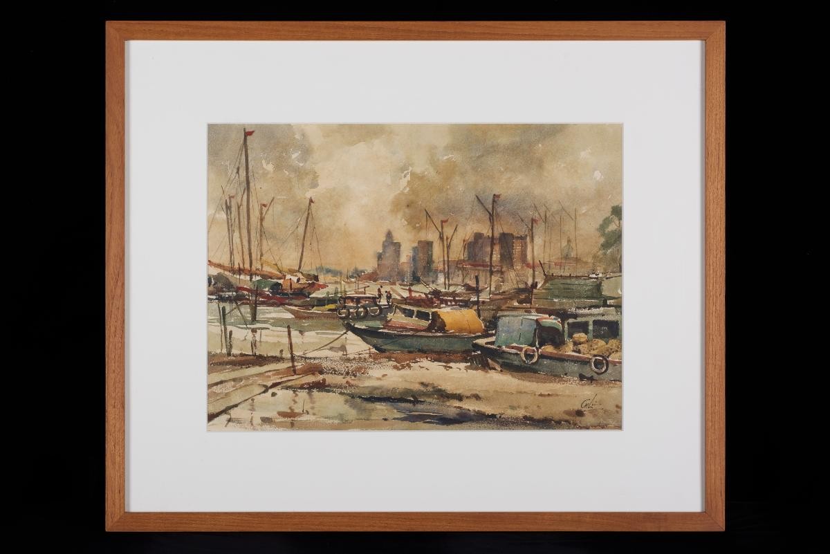 Cheong Soo Pieng, born in Xiamen (Amoy), China in 1914, was accomplished in ink painting having received training in art at Xiamen Academy of Art and Xinhua Academy of Fine Arts in Shanghai. A year after his arrival in Singapore in 1946, he started lecturing at Nanyang Academy of Fine Arts and stayed on till 1961. However it was a trip taken with fellow artists Chen Chong Swee, Chen Wen Hsi and Liu Kang in 1952 to Bali to seek inspiration and seek fresh subject matter that sealed his standing as a pivotal figure in Singapore’s modern art development. He was part of a group of artists that attempted to articulate a style identifiable and pertinent to post-war Singapore, then known collectively with Malaysia, as Malaya. This style, later crystallized as the Nanyang style, provided a foundation upon which future generations of artists learned and expanded on. A key element of the Nanyang style is the synthesis of Chinese pictorial elements and the diverse formalistic qualities from the School of Paris. In 1962, the Singapore government awarded Cheong with the Meritorious Service Medal. He passed away in 1983.‘Untitled (Boats)’ is an example of Cheong’s scrutiny of and interest in the regional landscape.