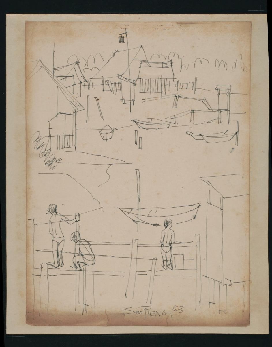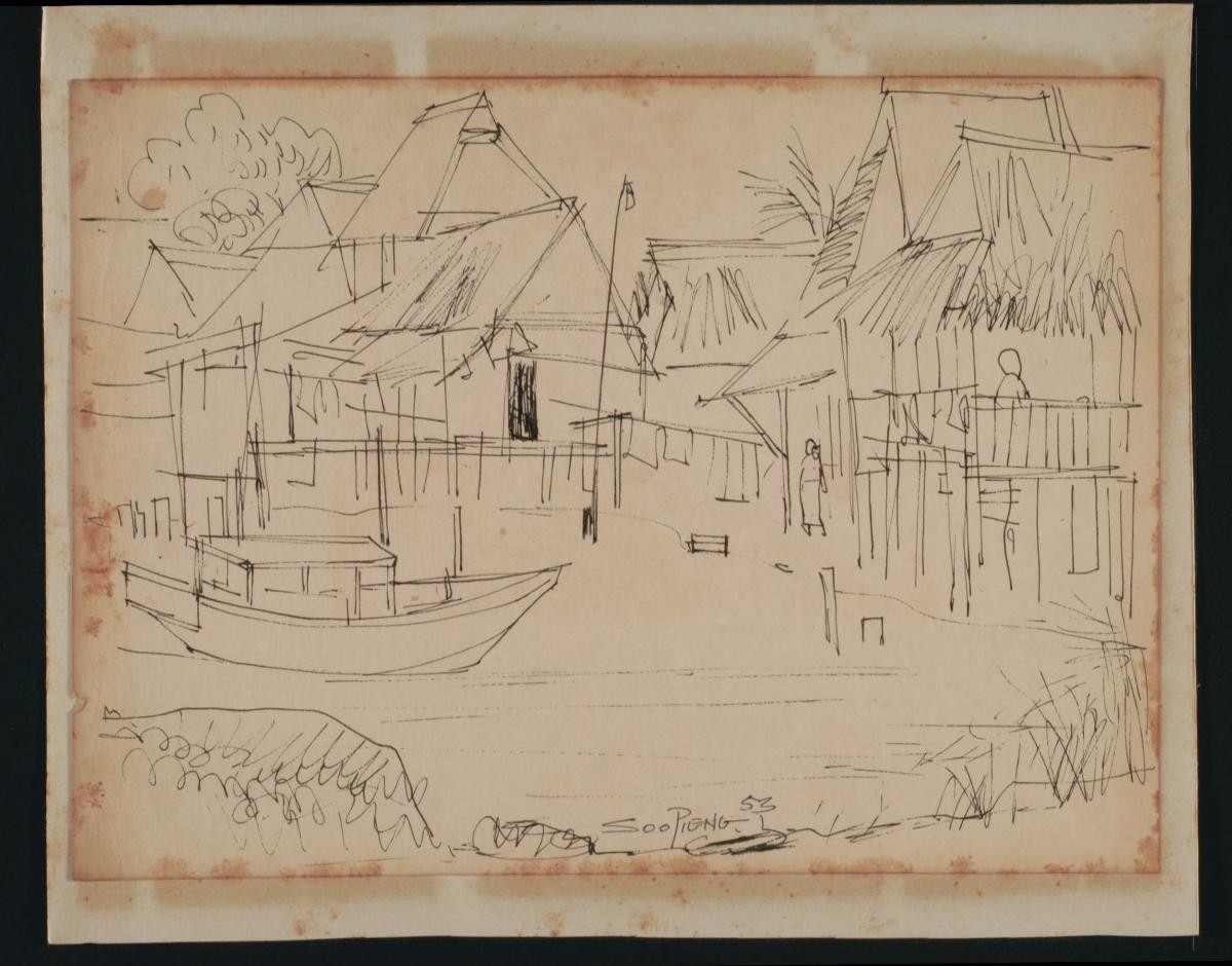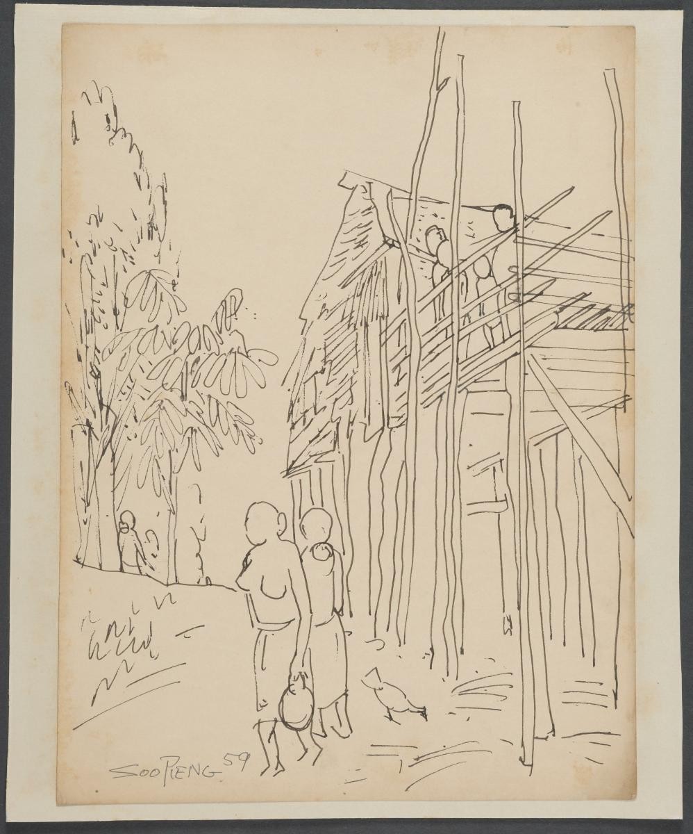 Cheong Soo Pieng, born in Xiamen (Amoy), China in 1914, was accomplished in ink painting having received training in art at Xiamen Academy of Art and Xinhua Academy of Fine Arts in Shanghai. A year after his arrival in Singapore in 1946, he started lecturing at Nanyang Academy of Fine Arts and stayed on till 1961. However it was a trip taken with fellow artists Chen Chong Swee, Chen Wen Hsi and Liu Kang in 1952 to Bali to seek inspiration and seek fresh subject matter that sealed his standing as a pivotal figure in Singapore’s modern art development. He was part of a group of artists that attempted to articulate a style identifiable and pertinent to post-war Singapore, then known collectively with Malaysia, as Malaya. This style, later crystallized as the Nanyang style, provided a foundation upon which future generations of artists learned and expanded on. A key element of the Nanyang style is the synthesis of Chinese pictorial elements and the diverse formalistic qualities from the School of Paris. In 1962, the Singapore government awarded Cheong with the Meritorious Service Medal. He passed away in 1983.‘Untitled (Wooden House on Stilts)’ is a reflection of the ‘localness of the place’, a theme that resonates strongly in Cheong’s art. This is one of countless sketches he made of the vernacular architecture and landscape of Southeast Asia which collectively provide useful entry points to understand the sources of his iconography.