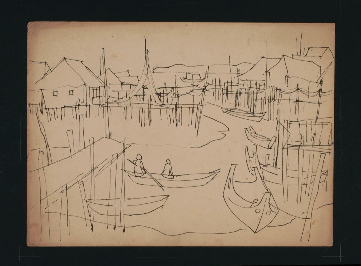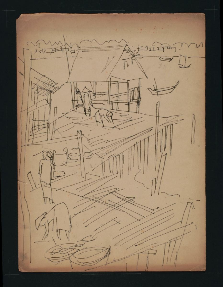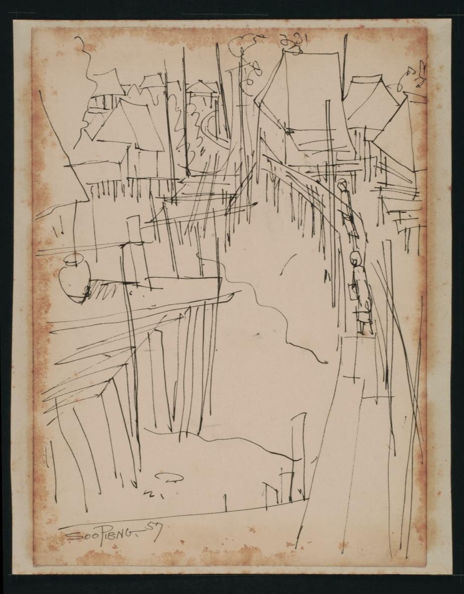Cheong Soo Pieng, born in Xiamen (Amoy), China in 1914, was accomplished in ink painting having received training in art at Xiamen Academy of Art and Xinhua Academy of Fine Arts in Shanghai. A year after his arrival in Singapore in 1946, he started lecturing at Nanyang Academy of Fine Arts and stayed on till 1961. However it was a trip taken with fellow artists Chen Chong Swee, Chen Wen Hsi and Liu Kang in 1952 to Bali to seek inspiration and seek fresh subject matter that sealed his standing as a pivotal figure in Singapore’s modern art development. He was part of a group of artists that attempted to articulate a style identifiable and pertinent to post-war Singapore, then known collectively with Malaysia, as Malaya. This style, later crystallized as the Nanyang style, provided a foundation upon which future generations of artists learned and expanded on. A key element of the Nanyang style is the synthesis of Chinese pictorial elements and the diverse formalistic qualities from the School of Paris. In 1962, the Singapore government awarded Cheong with the Meritorious Service Medal. He passed away in 1983.‘Untitled (Two People Opposite Kampung Across Stream)’ is a reflection of the ‘localness of the place’, a theme that resonates strongly in Cheong’s art. This is one of countless sketches he made of the landscape of Southeast Asia which collectively provide useful entry points to understand the sources of his iconography. ‘Kampung’ is village in Malay.