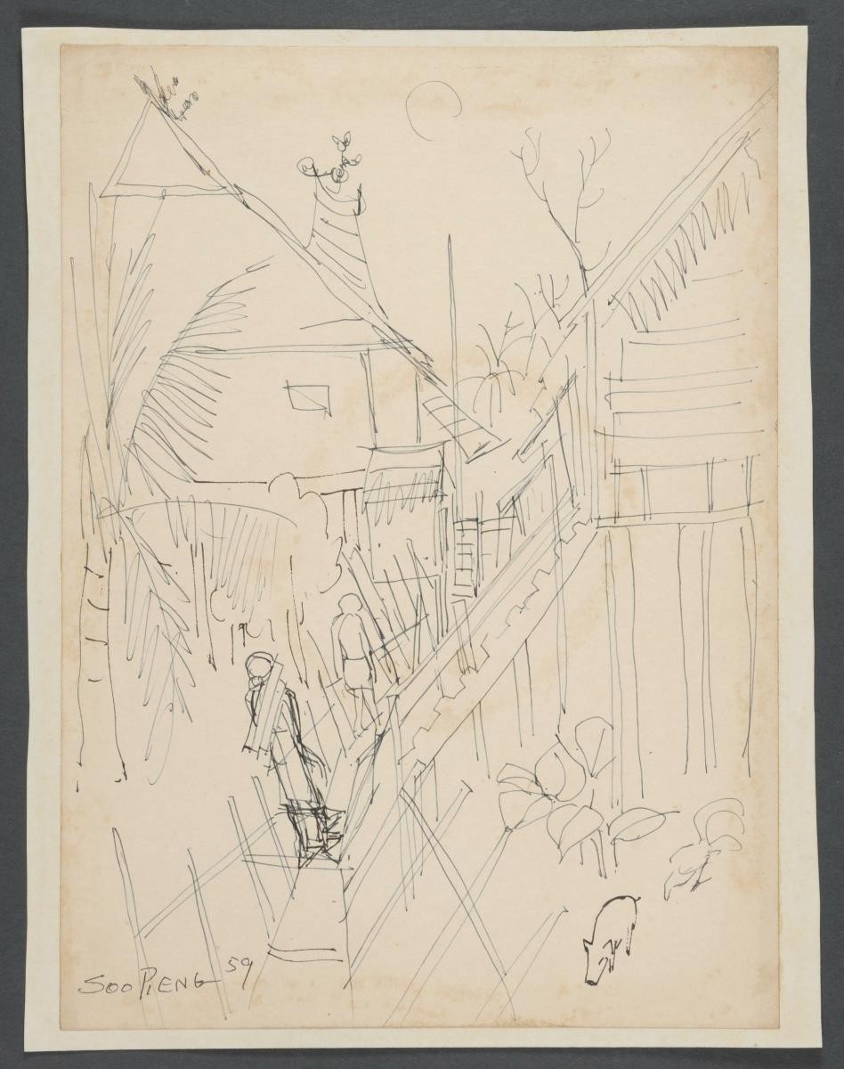 Cheong Soo Pieng, born in Xiamen (Amoy), China in 1914, was accomplished in ink painting having received training in art at Xiamen Academy of Art and Xinhua Academy of Fine Arts in Shanghai. A year after his arrival in Singapore in 1946, he started lecturing at Nanyang Academy of Fine Arts and stayed on till 1961. However it was a trip taken with fellow artists Chen Chong Swee, Chen Wen Hsi and Liu Kang in 1952 to Bali to seek inspiration and seek fresh subject matter that sealed his standing as a pivotal figure in Singapore’s modern art development. He was part of a group of artists that attempted to articulate a style identifiable and pertinent to post-war Singapore, then known collectively with Malaysia, as Malaya. This style, later crystallized as the Nanyang style, provided a foundation upon which future generations of artists learned and expanded on. A key element of the Nanyang style is the synthesis of Chinese pictorial elements and the diverse formalistic qualities from the School of Paris. In 1962, the Singapore government awarded Cheong with the Meritorious Service Medal. He passed away in 1983.An avid traveller and a keen observer, Cheong has produced countless sketches of places, people and their activities. ‘Untitled (Village with Two Pigs Walking Around)’ was sketched during his trip to Borneo in 1959.