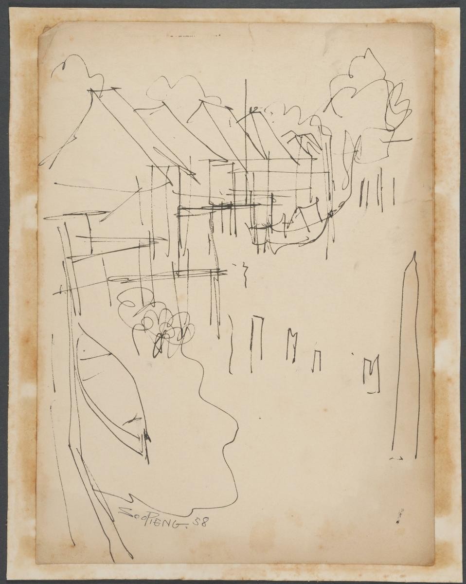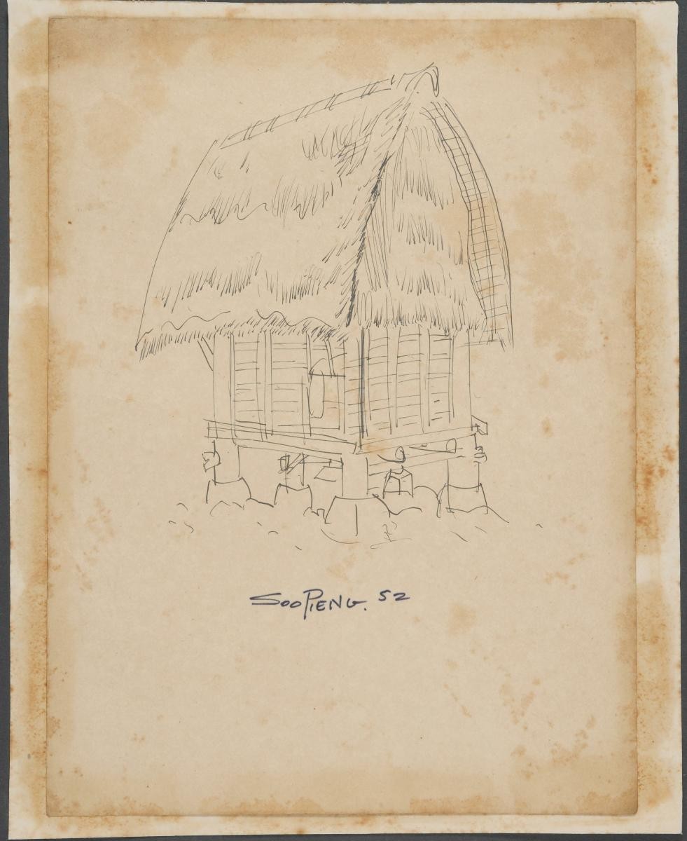 Cheong Soo Pieng, born in Xiamen (Amoy), China in 1914, was accomplished in ink painting having received training in art at Xiamen Academy of Art and Xinhua Academy of Fine Arts in Shanghai. A year after his arrival in Singapore in 1946, he started lecturing at Nanyang Academy of Fine Arts and stayed on till 1961. However it was a trip taken with fellow artists Chen Chong Swee, Chen Wen Hsi and Liu Kang in 1952 to Bali to seek inspiration and seek fresh subject matter that sealed his standing as a pivotal figure in Singapore’s modern art development. He was part of a group of artists that attempted to articulate a style identifiable and pertinent to post-war Singapore, then known collectively with Malaysia, as Malaya. This style, later crystallized as the Nanyang style, provided a foundation upon which future generations of artists learned and expanded on. A key element of the Nanyang style is the synthesis of Chinese pictorial elements and the diverse formalistic qualities from the School of Paris. In 1962, the Singapore government awarded Cheong with the Meritorious Service Medal. He passed away in 1983.An avid traveller and a keen observer, Cheong has produced countless sketches of places, people and their activities. ‘Untitled (Two Huts)’ was sketched during his trip to Borneo in 1959.