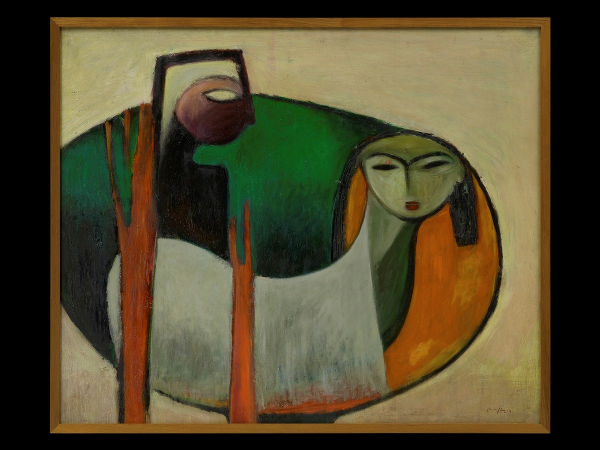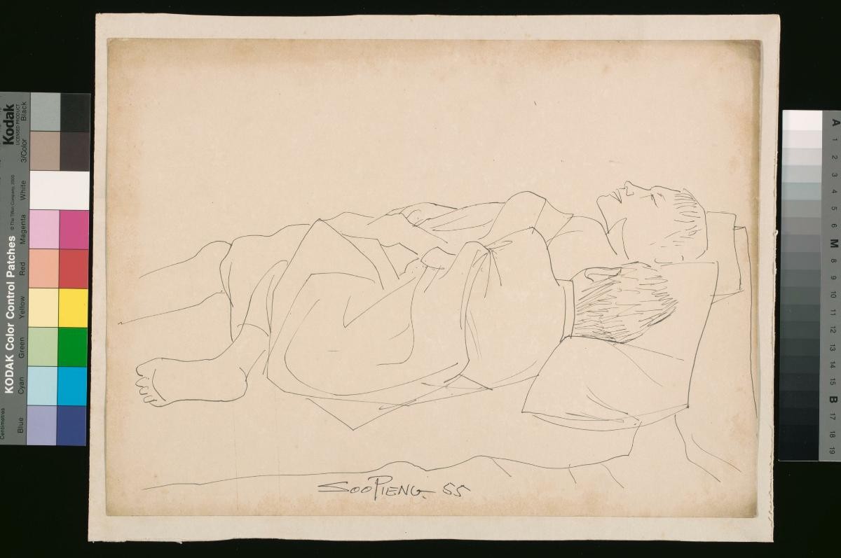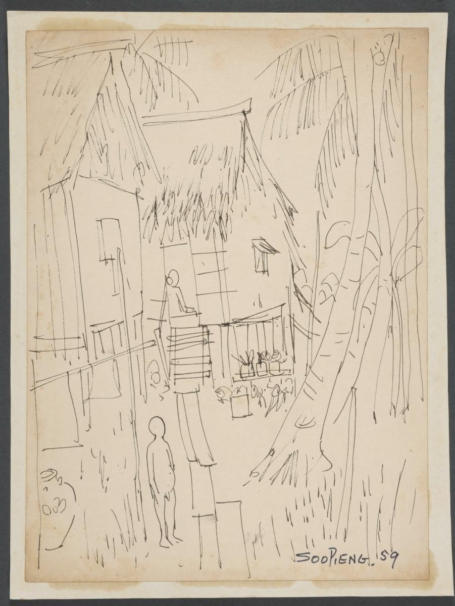 Cheong Soo Pieng, born in Xiamen (Amoy), China in 1914, was accomplished in ink painting having received training in art at Xiamen Academy of Art and Xinhua Academy of Fine Arts in Shanghai. A year after his arrival in Singapore in 1946, he started lecturing at Nanyang Academy of Fine Arts and stayed on till 1961. However it was a trip taken with fellow artists Chen Chong Swee, Chen Wen Hsi and Liu Kang in 1952 to Bali to seek inspiration and seek fresh subject matter that sealed his standing as a pivotal figure in Singapore’s modern art development. He was part of a group of artists that attempted to articulate a style identifiable and pertinent to post-war Singapore, then known collectively with Malaysia, as Malaya. This style, later crystallized as the Nanyang style, provided a foundation upon which future generations of artists learned and expanded on. A key element of the Nanyang style is the synthesis of Chinese pictorial elements and the diverse formalistic qualities from the School of Paris. In 1962, the Singapore government awarded Cheong with the Meritorious Service Medal. He passed away in 1983.‘Untitled (Small Hut with Two Figures)’ is an example of Cheong’s scrutiny of and interest in the people and landscape of the region.