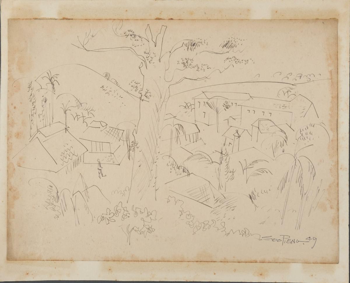 Cheong Soo Pieng, born in Xiamen (Amoy), China in 1914, was accomplished in ink painting having received training in art at Xiamen Academy of Art and Xinhua Academy of Fine Arts in Shanghai. A year after his arrival in Singapore in 1946, he started lecturing at Nanyang Academy of Fine Arts and stayed on till 1961. However it was a trip taken with fellow artists Chen Chong Swee, Chen Wen Hsi and Liu Kang in 1952 to Bali to seek inspiration and seek fresh subject matter that sealed his standing as a pivotal figure in Singapore’s modern art development. He was part of a group of artists that attempted to articulate a style identifiable and pertinent to post-war Singapore, then known collectively with Malaysia, as Malaya. This style, later crystallized as the Nanyang style, provided a foundation upon which future generations of artists learned and expanded on. A key element of the Nanyang style is the synthesis of Chinese pictorial elements and the diverse formalistic qualities from the School of Paris. In 1962, the Singapore government awarded Cheong with the Meritorious Service Medal. He passed away in 1983.‘Untitled (Ruins on The Hill)’ is an example of Cheong’s scrutiny of and interest in depicting the regional landscape.