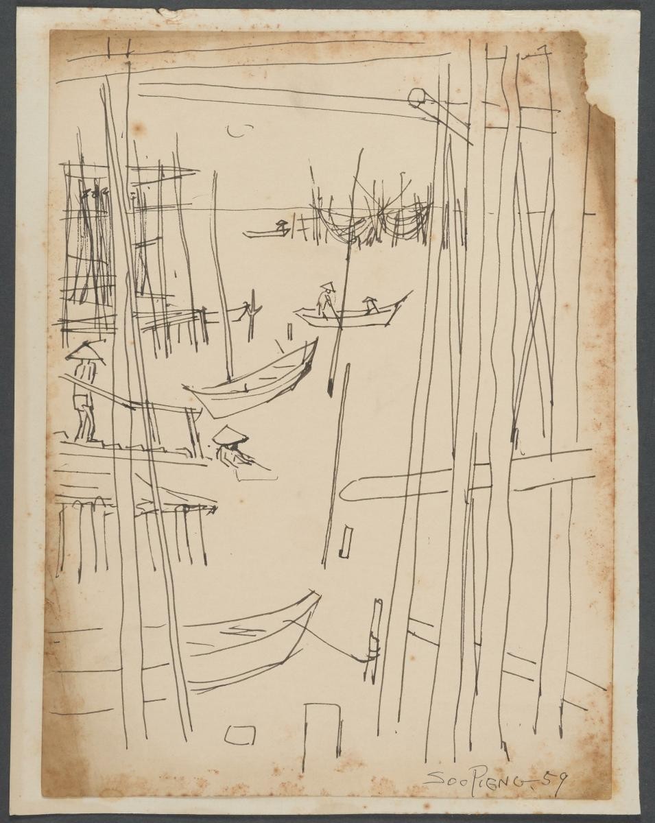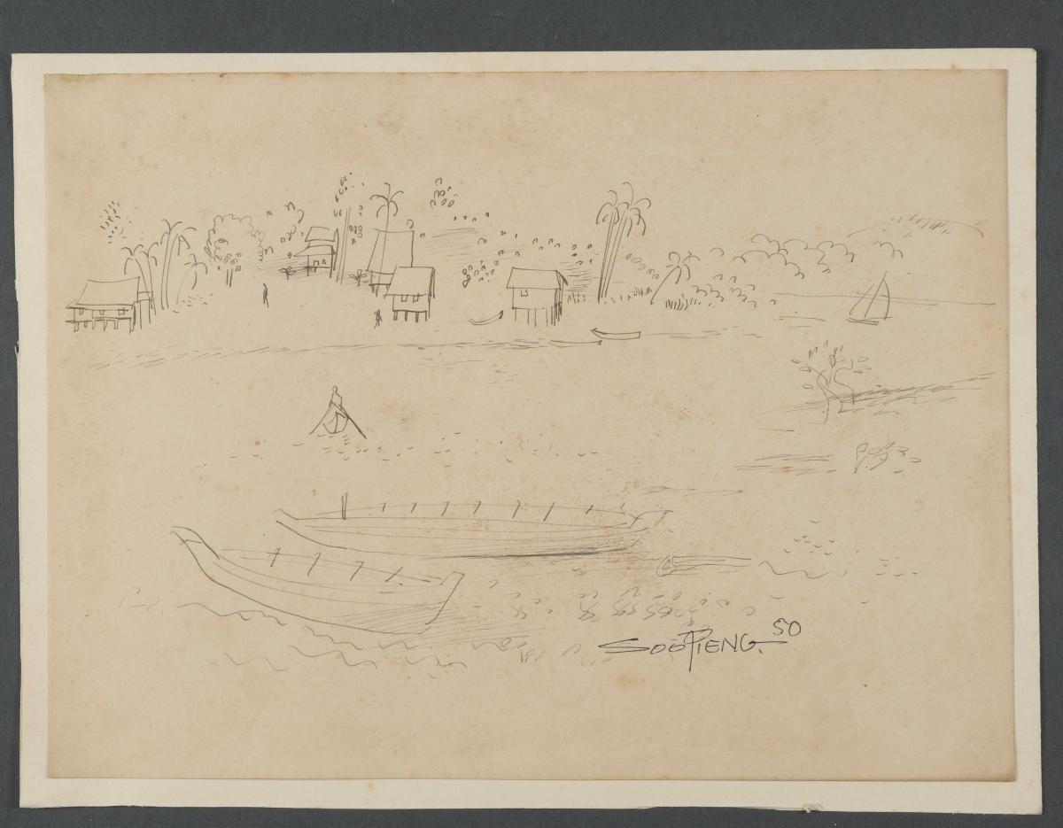 Cheong Soo Pieng, born in Xiamen (Amoy), China in 1914, was accomplished in ink painting having received training in art at Xiamen Academy of Art and Xinhua Academy of Fine Arts in Shanghai. A year after his arrival in Singapore in 1946, he started lecturing at Nanyang Academy of Fine Arts and stayed on till 1961. However it was a trip taken with fellow artists Chen Chong Swee, Chen Wen Hsi and Liu Kang in 1952 to Bali to seek inspiration and seek fresh subject matter that sealed his standing as a pivotal figure in Singapore’s modern art development. He was part of a group of artists that attempted to articulate a style identifiable and pertinent to post-war Singapore, then known collectively with Malaysia, as Malaya. This style, later crystallized as the Nanyang style, provided a foundation upon which future generations of artists learned and expanded on. A key element of the Nanyang style is the synthesis of Chinese pictorial elements and the diverse formalistic qualities from the School of Paris. In 1962, the Singapore government awarded Cheong with the Meritorious Service Medal. He passed away in 1983.‘Untitled (Sampans among The Trees)’ is deemed to be sketched during Cheong’s trip to Borneo in 1959 due to the apparent traditional loincloths worn by the locals. Framed by lush tropical growth, with ‘sampans’ (small wooden boats) on a lake, it presents an idyllic scene.