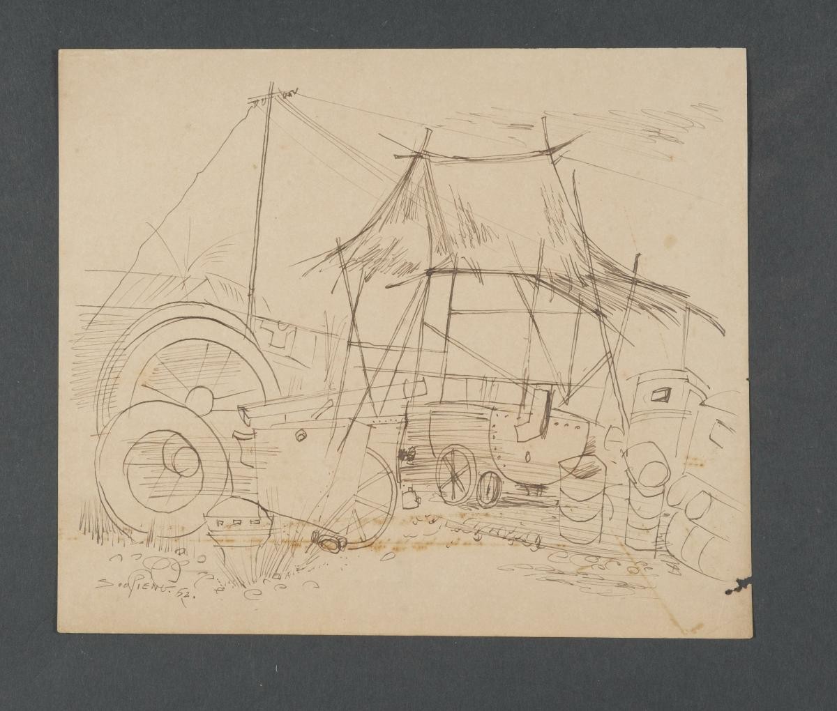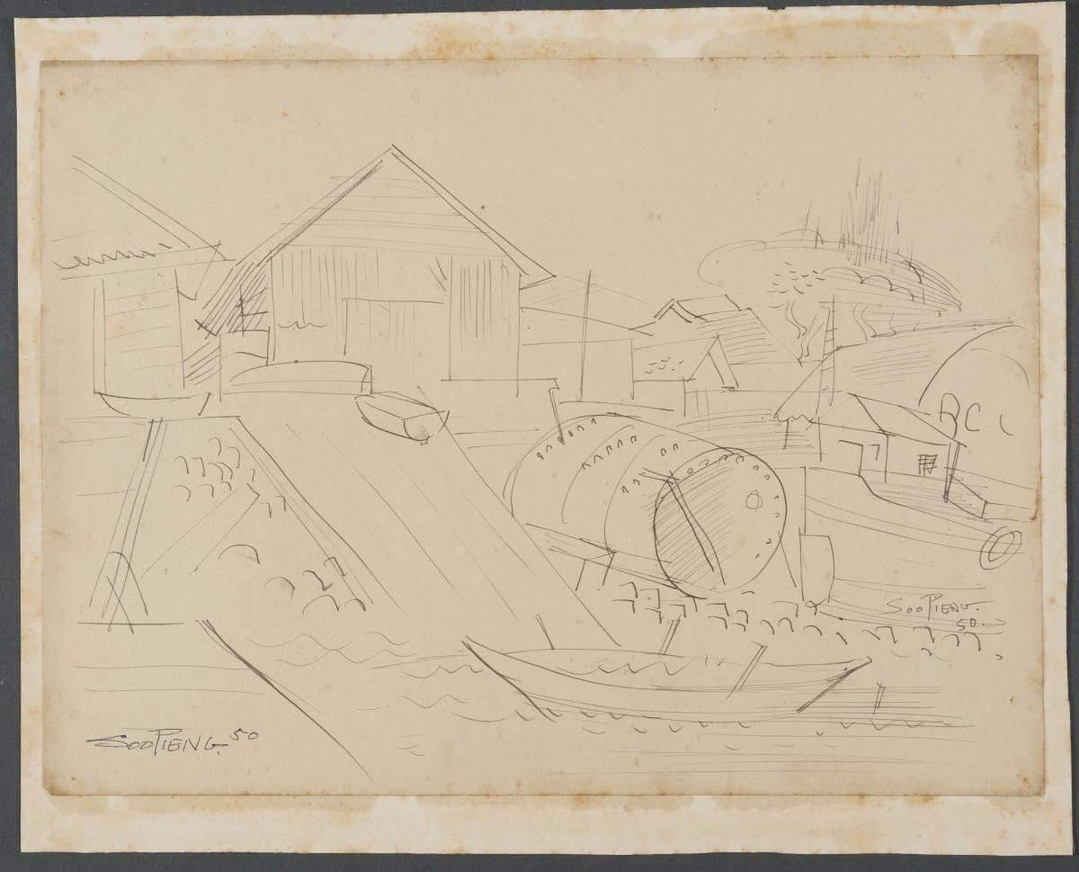 Cheong Soo Pieng, born in Xiamen (Amoy), China in 1914, was accomplished in ink painting having received training in art at Xiamen Academy of Art and Xinhua Academy of Fine Arts in Shanghai. A year after his arrival in Singapore in 1946, he started lecturing at Nanyang Academy of Fine Arts and stayed on till 1961. However it was a trip taken with fellow artists Chen Chong Swee, Chen Wen Hsi and Liu Kang in 1952 to Bali to seek inspiration and seek fresh subject matter that sealed his standing as a pivotal figure in Singapore’s modern art development. He was part of a group of artists that attempted to articulate a style identifiable and pertinent to post-war Singapore, then known collectively with Malaysia, as Malaya. This style, later crystallized as the Nanyang style, provided a foundation upon which future generations of artists learned and expanded on. A key element of the Nanyang style is the synthesis of Chinese pictorial elements and the diverse formalistic qualities from the School of Paris. In 1962, the Singapore government awarded Cheong with the Meritorious Service Medal. He passed away in 1983.In his scrutiny of the regional landscape, Cheong, who has an interest in forgotten spaces, depicts a junkyard with a view of a mosque in the background in ‘Untitled (View of The Mosque from Junkyard)’.