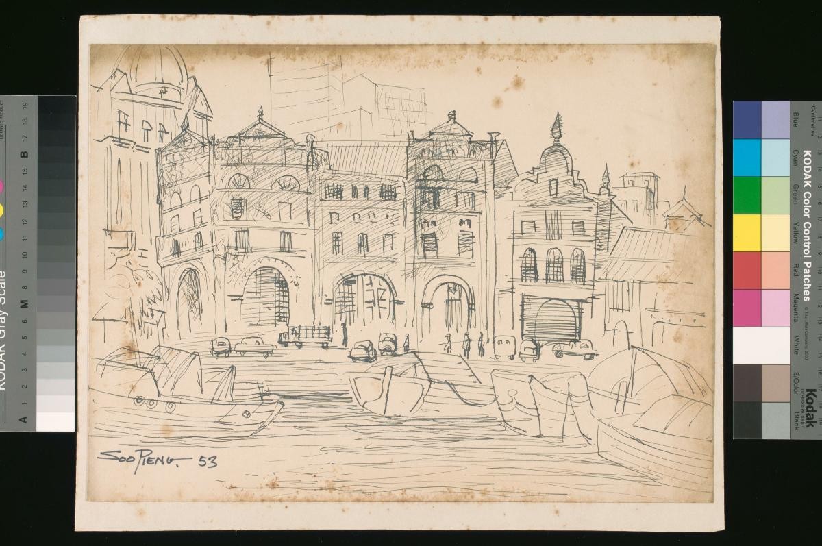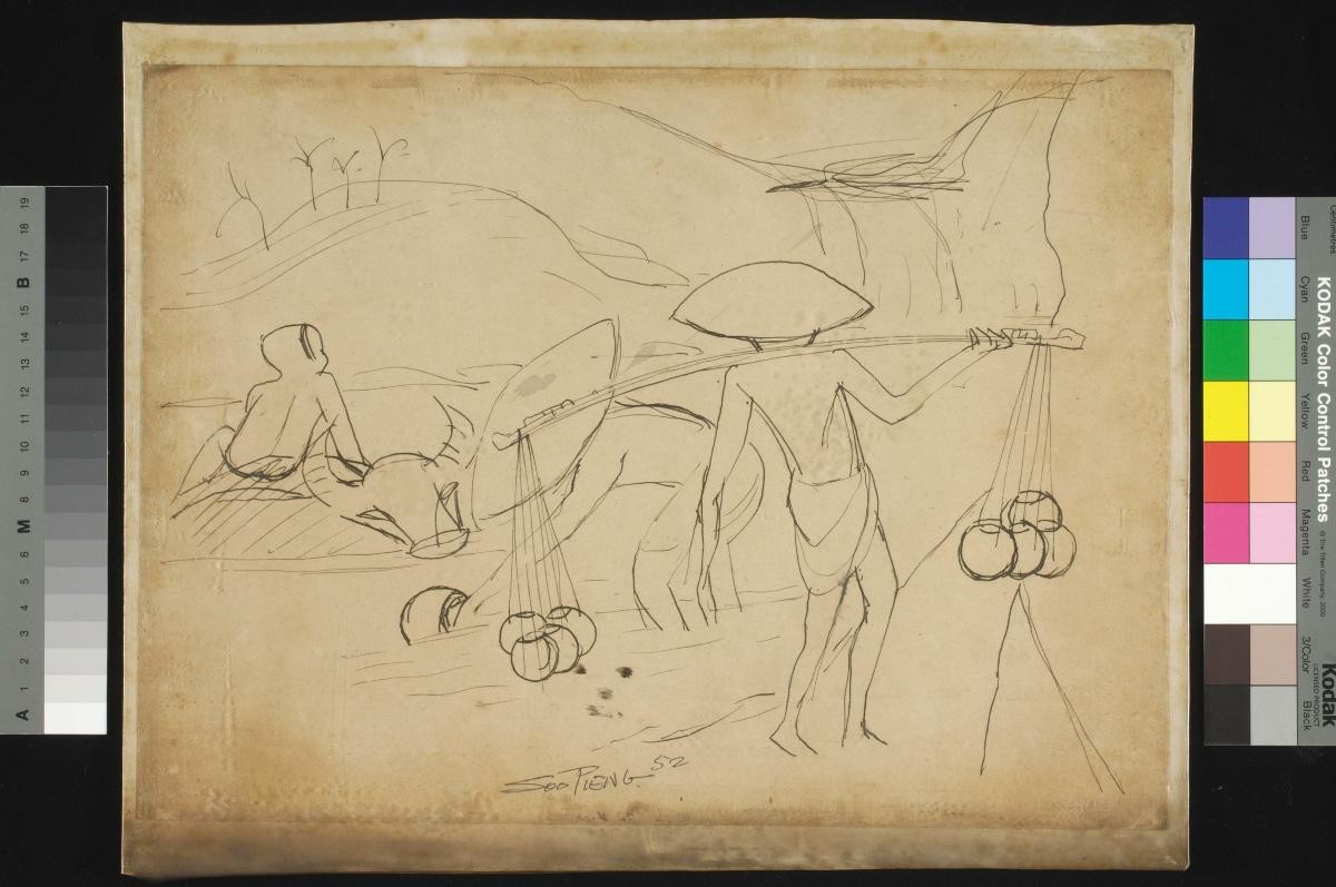 Cheong Soo Pieng, born in Xiamen (Amoy), China in 1914, was accomplished in ink painting having received training in art at Xiamen Academy of Art and Xinhua Academy of Fine Arts in Shanghai. A year after his arrival in Singapore in 1946, he started lecturing at Nanyang Academy of Fine Arts and stayed on till 1961. However it was a trip taken with fellow artists Chen Chong Swee, Chen Wen Hsi and Liu Kang in 1952 to Bali to seek inspiration and seek fresh subject matter that sealed his standing as a pivotal figure in Singapore’s modern art development. He was part of a group of artists that attempted to articulate a style identifiable and pertinent to post-war Singapore, then known collectively with Malaysia, as Malaya. This style, later crystallized as the Nanyang style, provided a foundation upon which future generations of artists learned and expanded on. A key element of the Nanyang style is the synthesis of Chinese pictorial elements and the diverse formalistic qualities from the School of Paris. In 1962, the Singapore government awarded Cheong with the Meritorious Service Medal. He passed away in 1983.‘Untitled (Activities by The River 1)’ is one of many sketches Cheong produced that signal his interest in the people of the region. Collectively they provide entry points to understand the sources of his iconography.