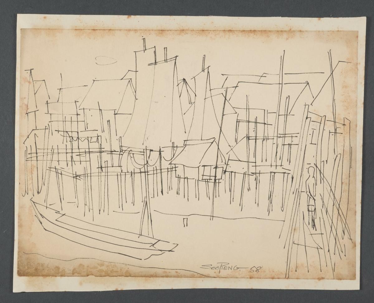 Cheong Soo Pieng, born in Xiamen (Amoy), China in 1914, was accomplished in ink painting having received training in art at Xiamen Academy of Art and Xinhua Academy of Fine Arts in Shanghai. A year after his arrival in Singapore in 1946, he started lecturing at Nanyang Academy of Fine Arts and stayed on till 1961. However it was a trip taken with fellow artists Chen Chong Swee, Chen Wen Hsi and Liu Kang in 1952 to Bali to seek inspiration and seek fresh subject matter that sealed his standing as a pivotal figure in Singapore’s modern art development. He was part of a group of artists that attempted to articulate a style identifiable and pertinent to post-war Singapore, then known collectively with Malaysia, as Malaya. This style, later crystallized as the Nanyang style, provided a foundation upon which future generations of artists learned and expanded on. A key element of the Nanyang style is the synthesis of Chinese pictorial elements and the diverse formalistic qualities from the School of Paris. In 1962, the Singapore government awarded Cheong with the Meritorious Service Medal. He passed away in 1983.In his scrutiny of the regional landscape, Cheong depicts a group of ‘kelongs’ (fish traps built on stilts) in ‘Untitled (Kelong with a Bridge and Drying Nets)’, reflecting the ‘localness of the place’ and providing an insight into the life of a fishing community.