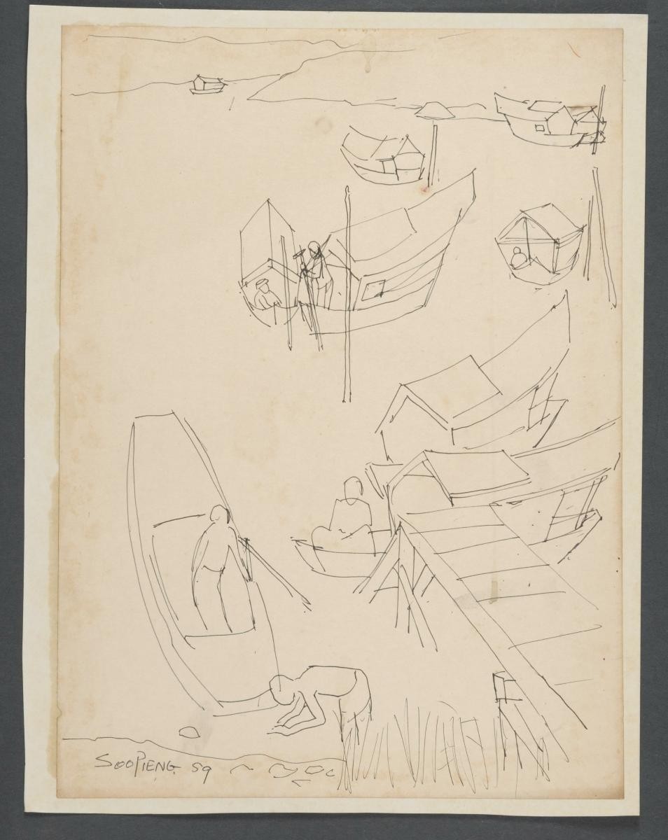 Cheong Soo Pieng, born in Xiamen (Amoy), China in 1914, was accomplished in ink painting having received training in art at Xiamen Academy of Art and Xinhua Academy of Fine Arts in Shanghai. A year after his arrival in Singapore in 1946, he started lecturing at Nanyang Academy of Fine Arts and stayed on till 1961. However it was a trip taken with fellow artists Chen Chong Swee, Chen Wen Hsi and Liu Kang in 1952 to Bali to seek inspiration and seek fresh subject matter that sealed his standing as a pivotal figure in Singapore’s modern art development. He was part of a group of artists that attempted to articulate a style identifiable and pertinent to post-war Singapore, then known collectively with Malaysia, as Malaya. This style, later crystallized as the Nanyang style, provided a foundation upon which future generations of artists learned and expanded on. A key element of the Nanyang style is the synthesis of Chinese pictorial elements and the diverse formalistic qualities from the School of Paris. In 1962, the Singapore government awarded Cheong with the Meritorious Service Medal. He passed away in 1983.‘Untitled (Three Sampans)’ is one of many sketches Cheong drew of rural folk going about their daily life and activities that eventually informed his art and iconography. ‘Sampans’ are small wooden boats.