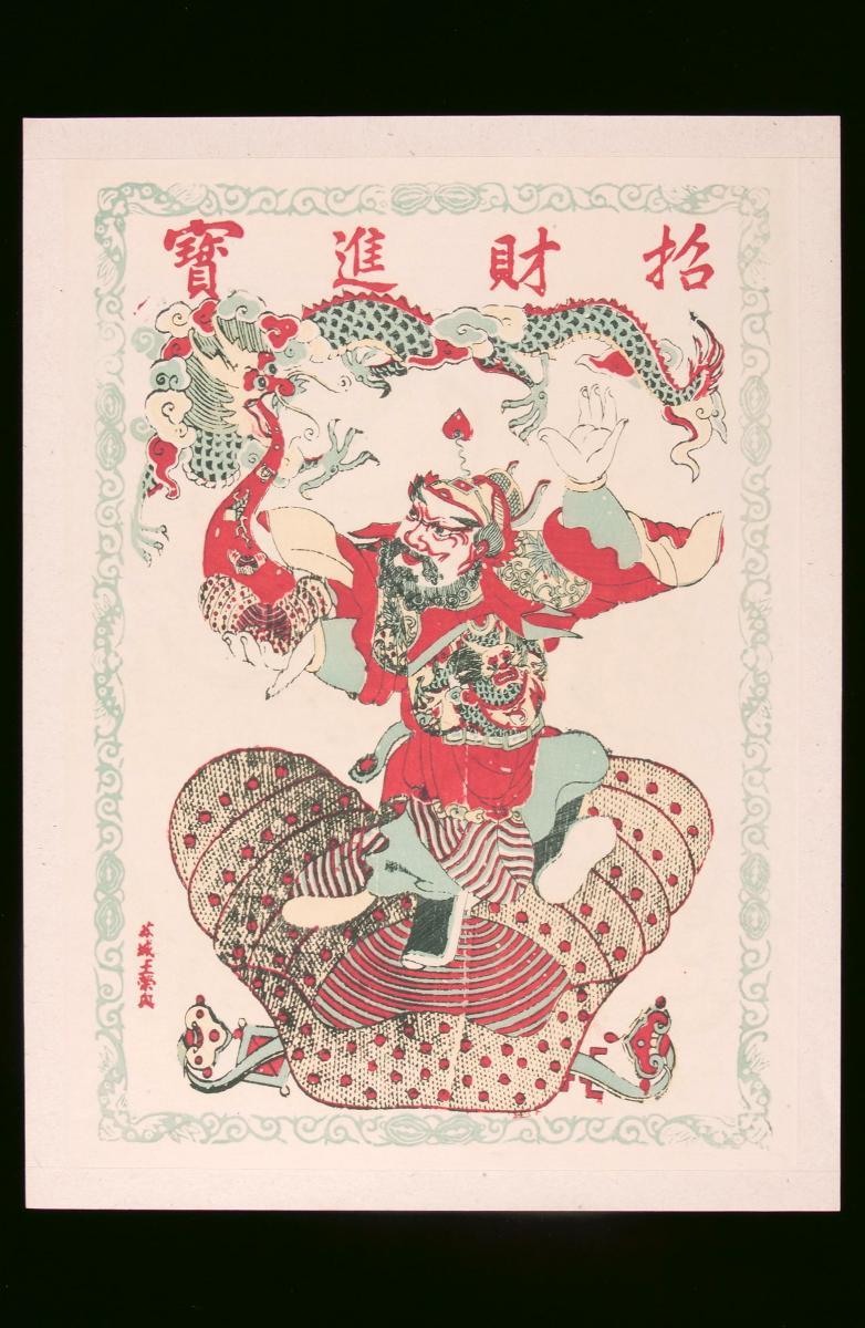 Chinese woodblock print depicting the God of Wealth and a dragon under seal prints containing wishes for the new year
