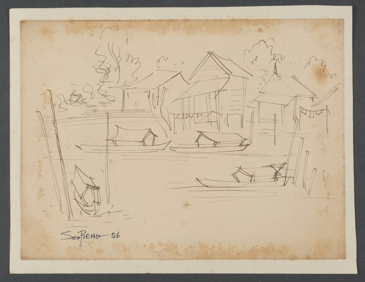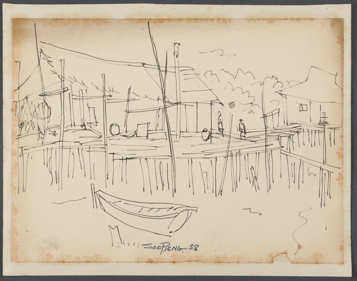 Cheong Soo Pieng, born in Xiamen (Amoy), China in 1914, was accomplished in ink painting having received training in art at Xiamen Academy of Art and Xinhua Academy of Fine Arts in Shanghai. A year after his arrival in Singapore in 1946, he started lecturing at Nanyang Academy of Fine Arts and stayed on till 1961. However it was a trip taken with fellow artists Chen Chong Swee, Chen Wen Hsi and Liu Kang in 1952 to Bali to seek inspiration and seek fresh subject matter that sealed his standing as a pivotal figure in Singapore’s modern art development. He was part of a group of artists that attempted to articulate a style identifiable and pertinent to post-war Singapore, then known collectively with Malaysia, as Malaya. This style, later crystallized as the Nanyang style, provided a foundation upon which future generations of artists learned and expanded on. A key element of the Nanyang style is the synthesis of Chinese pictorial elements and the diverse formalistic qualities from the School of Paris. In 1962, the Singapore government awarded Cheong with the Meritorious Service Medal. He passed away in 1983.In his scrutiny of the Malayan landscape, Cheong depicts an idyllic coastal village in ‘Untitled (Kelongs with A Bridge and Two Sampans)’. ‘Kelongs’ are fish traps built on stilts; ‘sampans’ are small wooden boats.