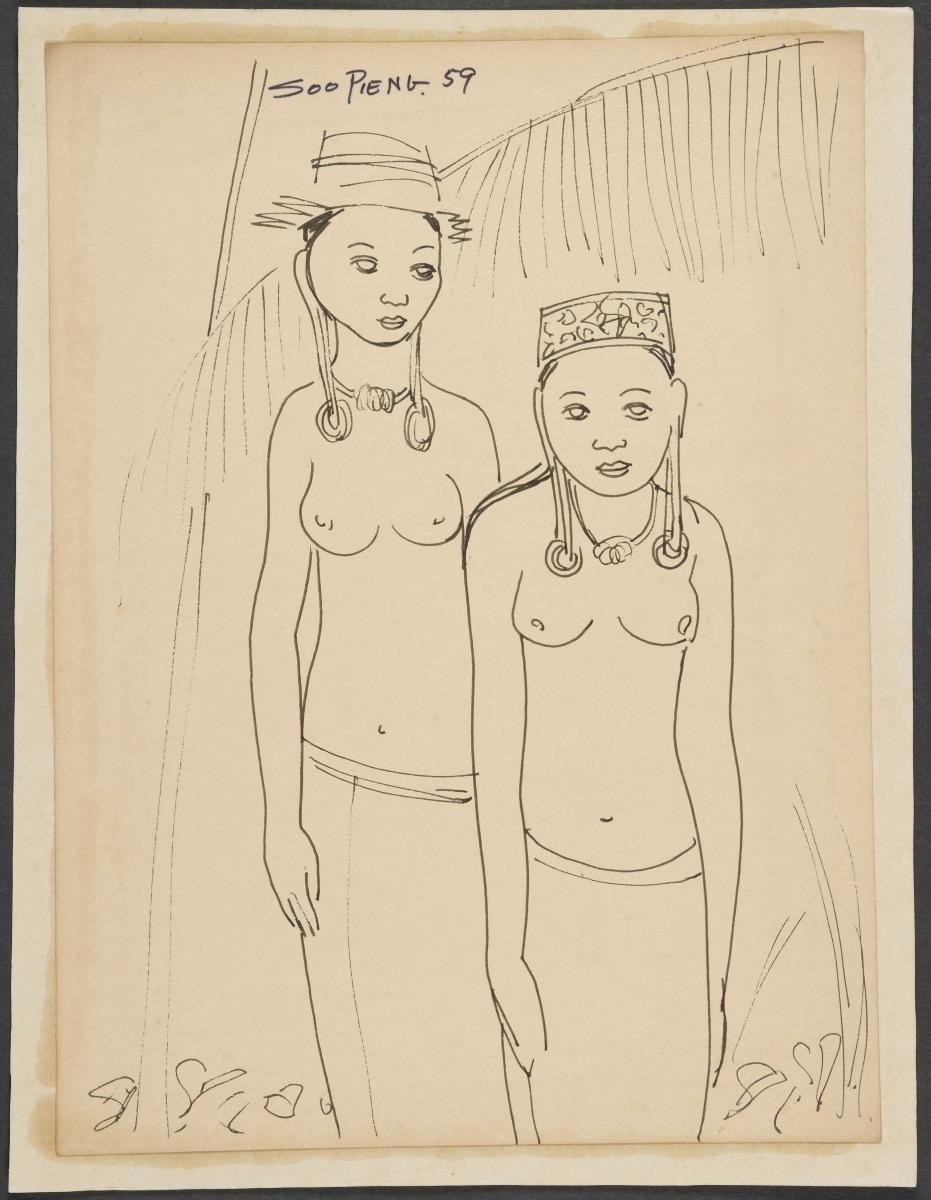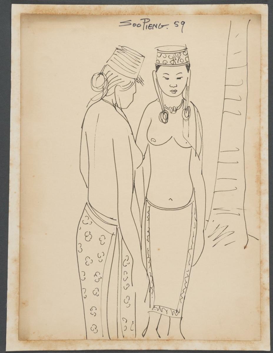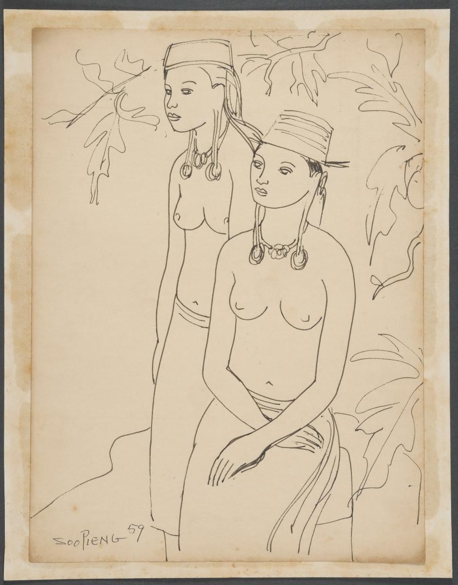 Cheong Soo Pieng, born in Xiamen (Amoy), China in 1914, was accomplished in ink painting having received training in art at Xiamen Academy of Art and Xinhua Academy of Fine Arts in Shanghai. A year after his arrival in Singapore in 1946, he started lecturing at Nanyang Academy of Fine Arts and stayed on till 1961. However it was a trip taken with fellow artists Chen Chong Swee, Chen Wen Hsi and Liu Kang in 1952 to Bali to seek inspiration and seek fresh subject matter that sealed his standing as a pivotal figure in Singapore’s modern art development. He was part of a group of artists that attempted to articulate a style identifiable and pertinent to post-war Singapore, then known collectively with Malaysia, as Malaya. This style, later crystallized as the Nanyang style, provided a foundation upon which future generations of artists learned and expanded on. A key element of the Nanyang style is the synthesis of Chinese pictorial elements and the diverse formalistic qualities from the School of Paris. In 1962, the Singapore government awarded Cheong with the Meritorious Service Medal. He passed away in 1983.‘Untitled (A Dayak Man by A Tree with A Birdcage)’ is one of many figurative studies of the ethnic group Cheong produced during his trip to Borneo in 1959 that eventually informed his art and iconography.