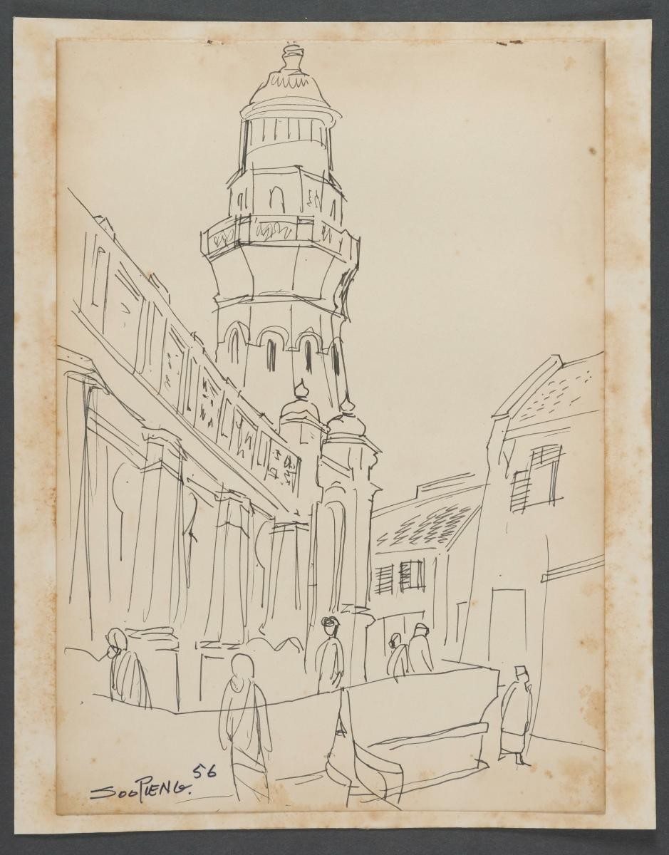 Cheong Soo Pieng, born in Xiamen (Amoy), China in 1914, was accomplished in ink painting having received training in art at Xiamen Academy of Art and Xinhua Academy of Fine Arts in Shanghai. A year after his arrival in Singapore in 1946, he started lecturing at Nanyang Academy of Fine Arts and stayed on till 1961. However it was a trip taken with fellow artists Chen Chong Swee, Chen Wen Hsi and Liu Kang in 1952 to Bali to seek inspiration and seek fresh subject matter that sealed his standing as a pivotal figure in Singapore’s modern art development. He was part of a group of artists that attempted to articulate a style identifiable and pertinent to post-war Singapore, then known collectively with Malaysia, as Malaya. This style, later crystallized as the Nanyang style, provided a foundation upon which future generations of artists learned and expanded on. A key element of the Nanyang style is the synthesis of Chinese pictorial elements and the diverse formalistic qualities from the School of Paris. In 1962, the Singapore government awarded Cheong with the Meritorious Service Medal. He passed away in 1983.The meticulously sketched architecture of the mosque in ‘Untitled (Mosque)’ is an example of Cheong’s scrutiny of and his interest in depicting the regional landscape.