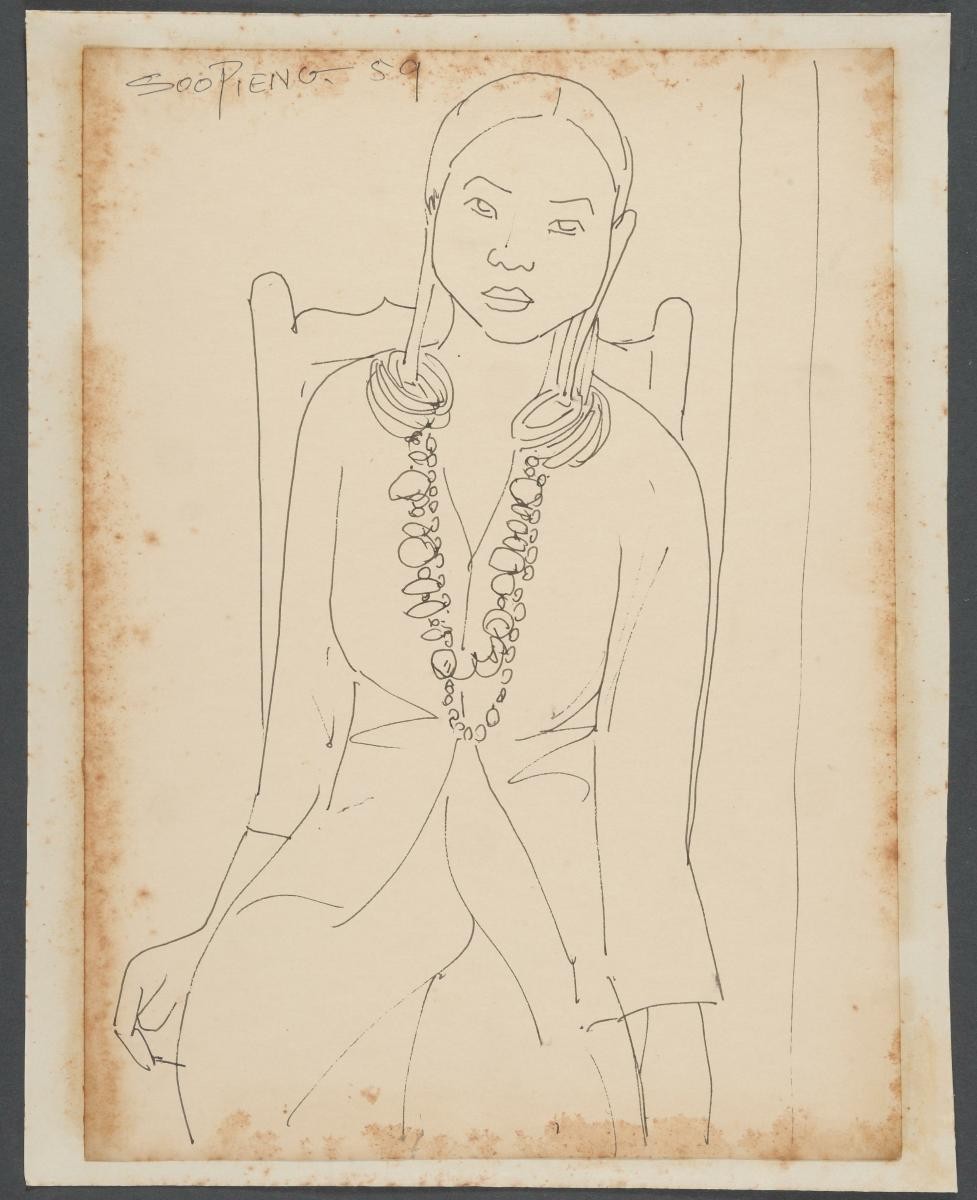 Cheong Soo Pieng, born in Xiamen (Amoy), China in 1914, was accomplished in ink painting having received training in art at Xiamen Academy of Art and Xinhua Academy of Fine Arts in Shanghai. A year after his arrival in Singapore in 1946, he started lecturing at Nanyang Academy of Fine Arts and stayed on till 1961. However it was a trip taken with fellow artists Chen Chong Swee, Chen Wen Hsi and Liu Kang in 1952 to Bali to seek inspiration and seek fresh subject matter that sealed his standing as a pivotal figure in Singapore’s modern art development. He was part of a group of artists that attempted to articulate a style identifiable and pertinent to post-war Singapore, then known collectively with Malaysia, as Malaya. This style, later crystallized as the Nanyang style, provided a foundation upon which future generations of artists learned and expanded on. A key element of the Nanyang style is the synthesis of Chinese pictorial elements and the diverse formalistic qualities from the School of Paris. In 1962, the Singapore government awarded Cheong with the Meritorious Service Medal. He passed away in 1983.‘Untitled (Two Dayak Women Chatting by The Tree 2)’ is one of many figurative studies of the ethnic group Cheong produced during his trip to Borneo in 1959 that eventually informed his art and iconography.