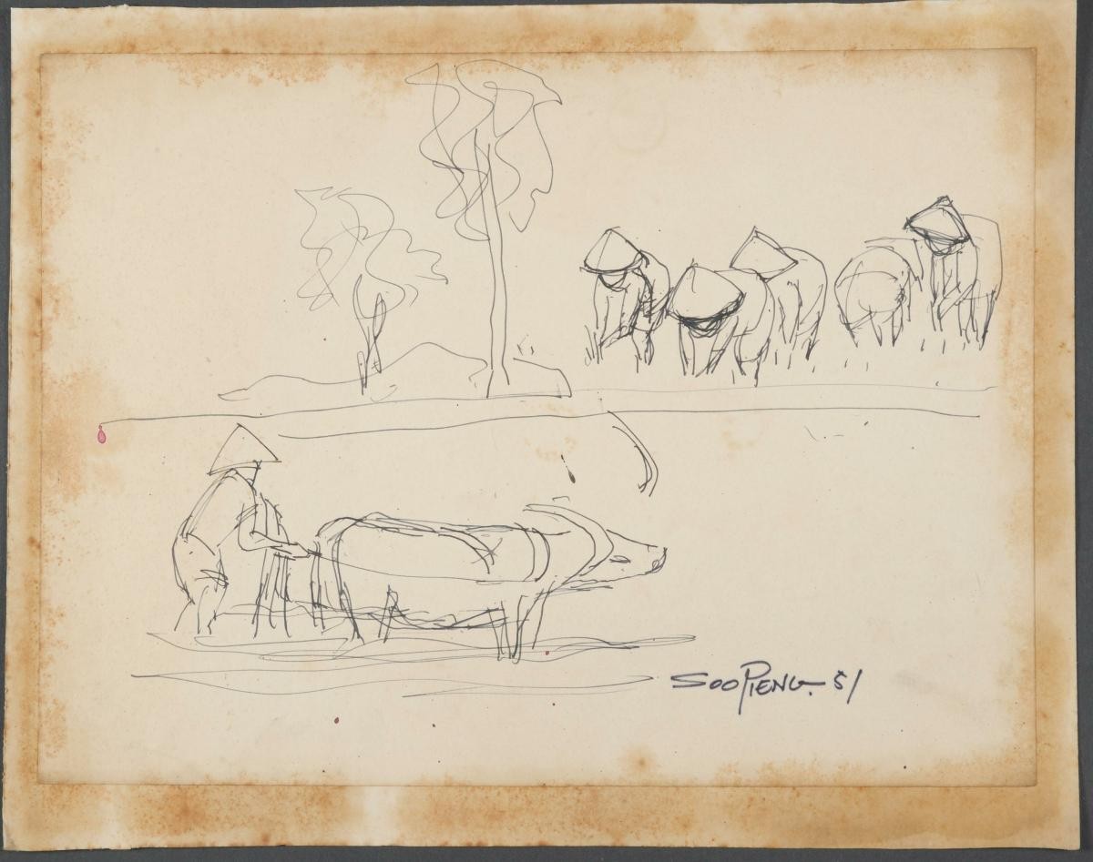Cheong Soo Pieng, born in Xiamen (Amoy), China in 1914, was accomplished in ink painting having received training in art at Xiamen Academy of Art and Xinhua Academy of Fine Arts in Shanghai. A year after his arrival in Singapore in 1946, he started lecturing at Nanyang Academy of Fine Arts and stayed on till 1961. However it was a trip taken with fellow artists Chen Chong Swee, Chen Wen Hsi and Liu Kang in 1952 to Bali to seek inspiration and seek fresh subject matter that sealed his standing as a pivotal figure in Singapore’s modern art development. He was part of a group of artists that attempted to articulate a style identifiable and pertinent to post-war Singapore, then known collectively with Malaysia, as Malaya. This style, later crystallized as the Nanyang style, provided a foundation upon which future generations of artists learned and expanded on. A key element of the Nanyang style is the synthesis of Chinese pictorial elements and the diverse formalistic qualities from the School of Paris. In 1962, the Singapore government awarded Cheong with the Meritorious Service Medal. He passed away in 1983.‘Untitled (Farmers Digging with Hoes)’ is an example of Cheong’s interest in people and their activities. A keen observer, he made countless sketches of the diverse ethnic groups during his travel around Southeast Asia.