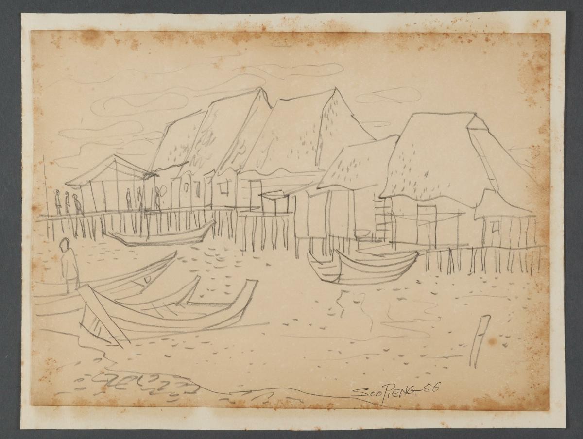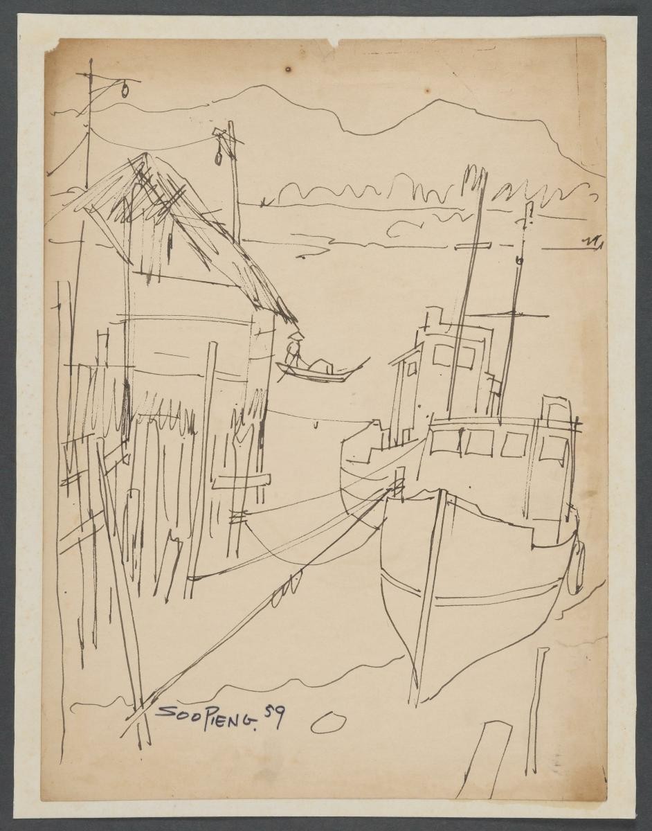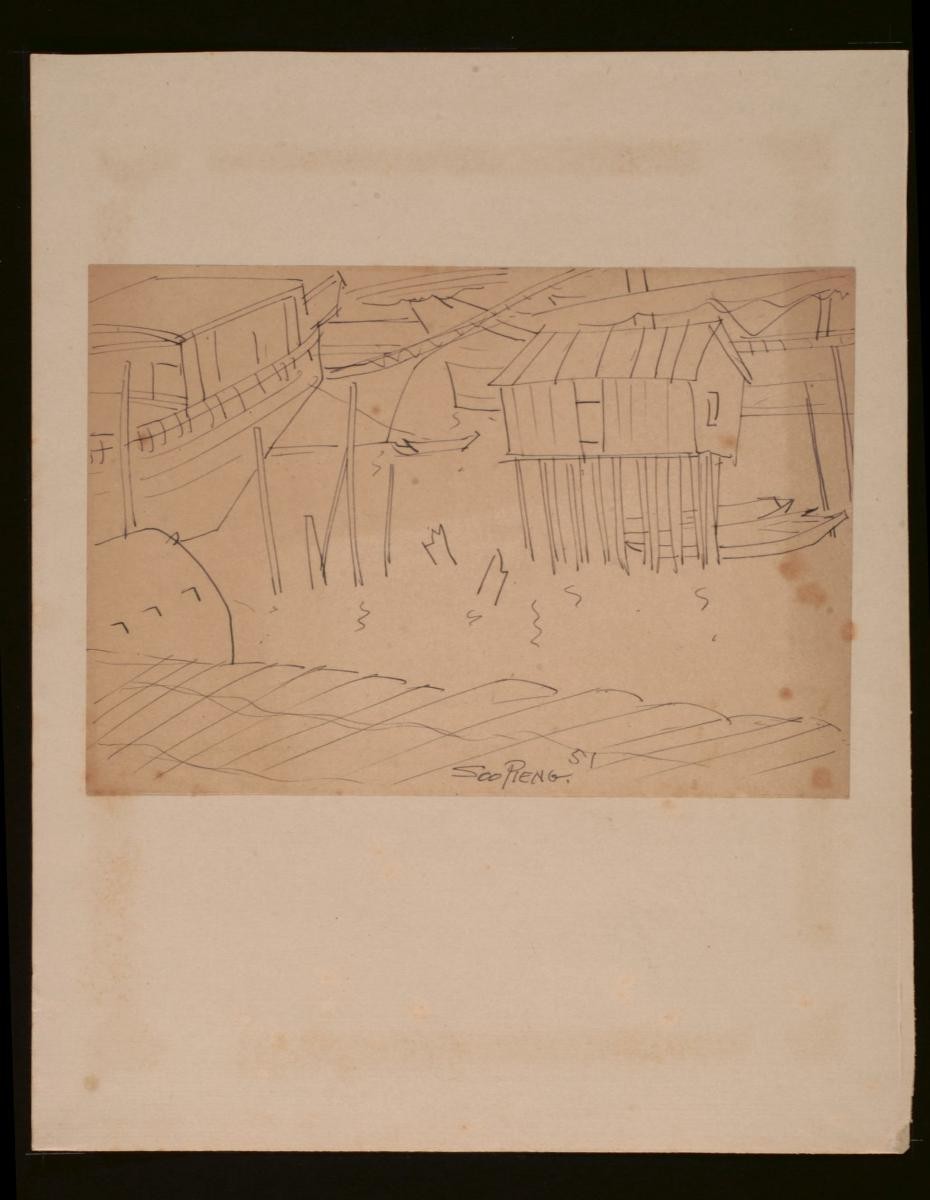 Cheong Soo Pieng, born in Xiamen (Amoy), China in 1914, was accomplished in ink painting having received training in art at Xiamen Academy of Art and Xinhua Academy of Fine Arts in Shanghai. A year after his arrival in Singapore in 1946, he started lecturing at Nanyang Academy of Fine Arts and stayed on till 1961. However it was a trip taken with fellow artists Chen Chong Swee, Chen Wen Hsi and Liu Kang in 1952 to Bali to seek inspiration and seek fresh subject matter that sealed his standing as a pivotal figure in Singapore’s modern art development. He was part of a group of artists that attempted to articulate a style identifiable and pertinent to post-war Singapore, then known collectively with Malaysia, as Malaya. This style, later crystallized as the Nanyang style, provided a foundation upon which future generations of artists learned and expanded on. A key element of the Nanyang style is the synthesis of Chinese pictorial elements and the diverse formalistic qualities from the School of Paris. In 1962, the Singapore government awarded Cheong with the Meritorious Service Medal. He passed away in 1983.‘Untitled (Kelong with Boats)’ is an example of Cheong’s scrutiny of and interest in the landscape of the region. With the ‘kelongs’ (fish traps built on stilts) reduced to simple outline and minimal detail, this sketch could be a study in grouping and clustering.