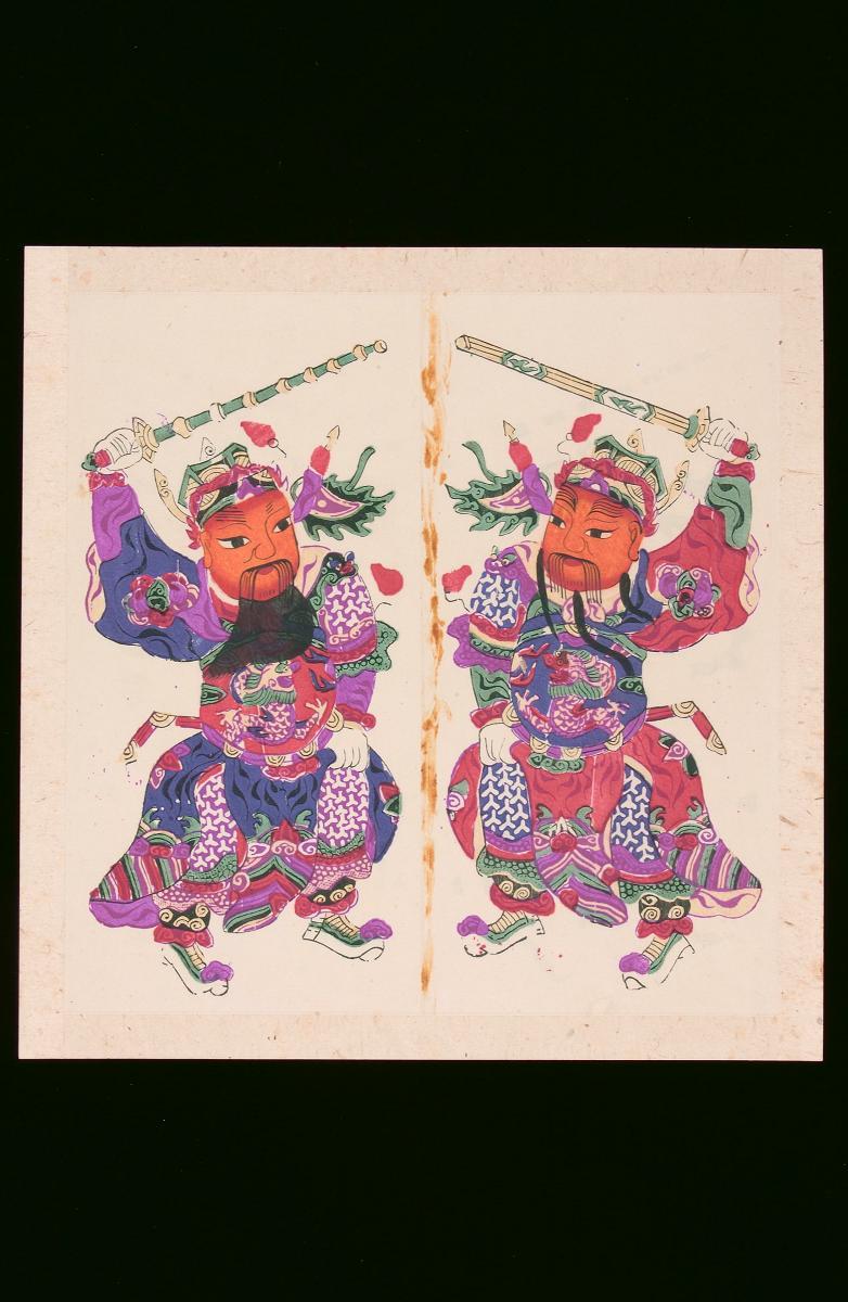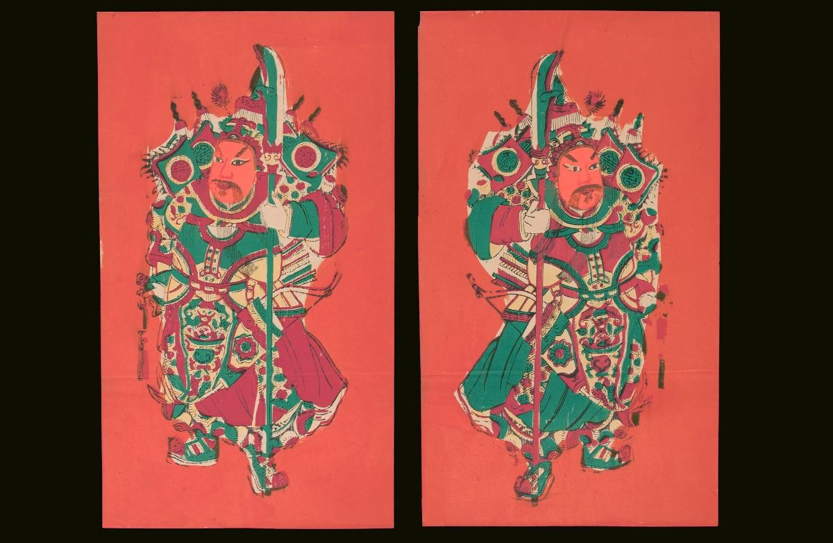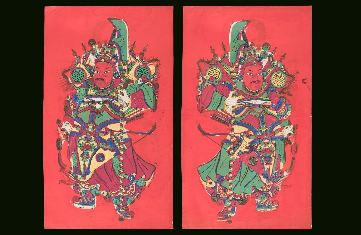 One of a pair of Chinese woodblock prints depicting Military Door Gods holding fans and vases of peonies