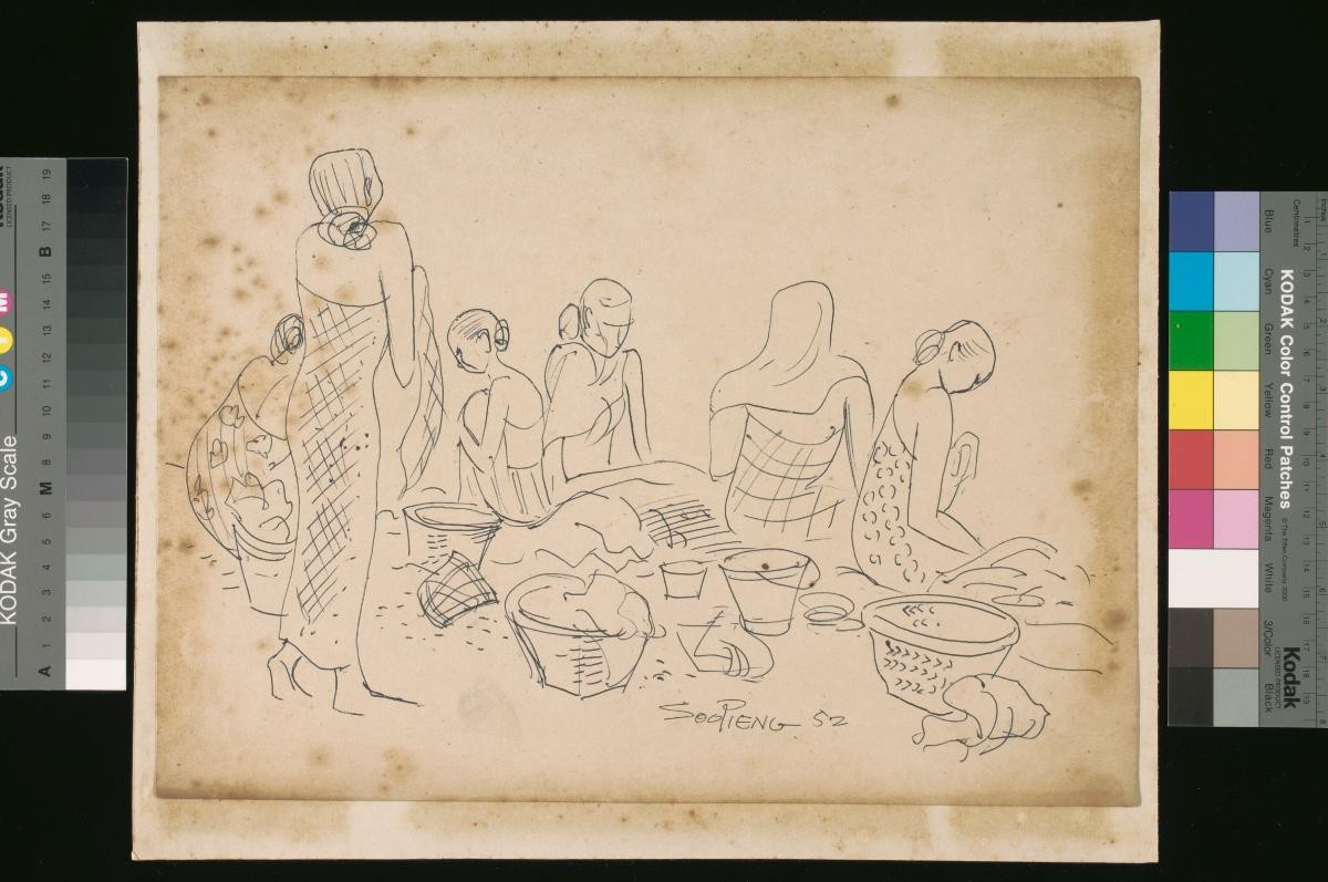 Cheong Soo Pieng, born in Xiamen (Amoy), China in 1914, was accomplished in ink painting having received training in art at Xiamen Academy of Art and Xinhua Academy of Fine Arts in Shanghai. A year after his arrival in Singapore in 1946, he started lecturing at Nanyang Academy of Fine Arts and stayed on till 1961. However it was a trip taken with fellow artists Chen Chong Swee, Chen Wen Hsi and Liu Kang in 1952 to Bali to seek inspiration and seek fresh subject matter that sealed his standing as a pivotal figure in Singapore’s modern art development. He was part of a group of artists that attempted to articulate a style identifiable and pertinent to post-war Singapore, then known collectively with Malaysia, as Malaya. This style, later crystallized as the Nanyang style, provided a foundation upon which future generations of artists learned and expanded on. A key element of the Nanyang style is the synthesis of Chinese pictorial elements and the diverse formalistic qualities from the School of Paris. In 1962, the Singapore government awarded Cheong with the Meritorious Service Medal. He passed away in 1983.In his scrutiny of the regional landscape, Cheong has produced many sketches of people going about their daily activiites such as that shown in ‘Untitled (Woman drying Clothes)’.