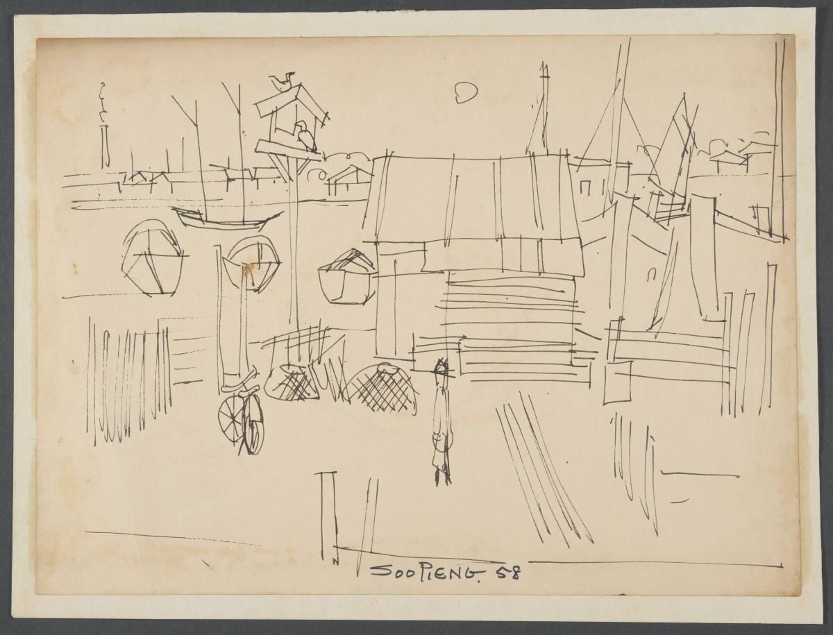 Cheong Soo Pieng, born in Xiamen (Amoy), China in 1914, was accomplished in ink painting having received training in art at Xiamen Academy of Art and Xinhua Academy of Fine Arts in Shanghai. A year after his arrival in Singapore in 1946, he started lecturing at Nanyang Academy of Fine Arts and stayed on till 1961. However it was a trip taken with fellow artists Chen Chong Swee, Chen Wen Hsi and Liu Kang in 1952 to Bali to seek inspiration and seek fresh subject matter that sealed his standing as a pivotal figure in Singapore’s modern art development. He was part of a group of artists that attempted to articulate a style identifiable and pertinent to post-war Singapore, then known collectively with Malaysia, as Malaya. This style, later crystallized as the Nanyang style, provided a foundation upon which future generations of artists learned and expanded on. A key element of the Nanyang style is the synthesis of Chinese pictorial elements and the diverse formalistic qualities from the School of Paris. In 1962, the Singapore government awarded Cheong with the Meritorious Service Medal. He passed away in 1983.In his scrutiny of the regional landscape, Cheong depicts an idyllic scene in ‘Untitled (Huts by A Stream)’. The fluid lines employed for the vegetation and river underscore the influence of European abstraction on his practice.