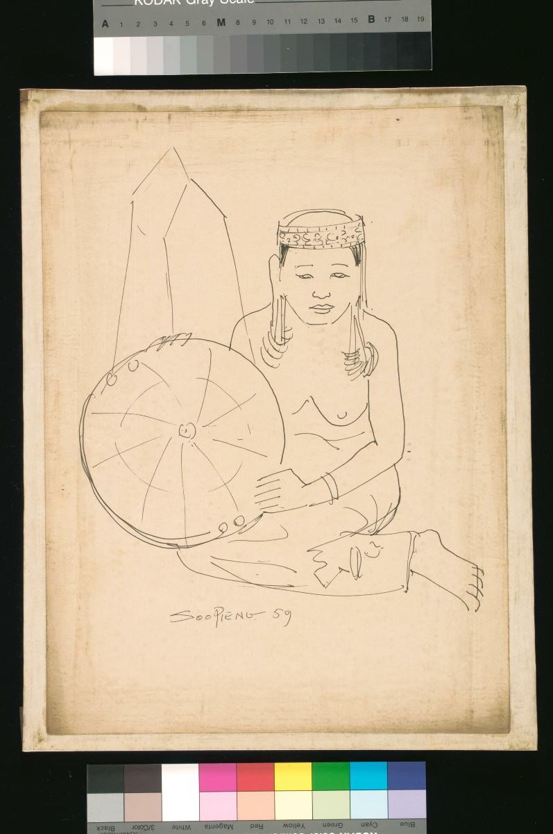 Cheong Soo Pieng, born in Xiamen (Amoy), China in 1914, was accomplished in ink painting having received training in art at Xiamen Academy of Art and Xinhua Academy of Fine Arts in Shanghai. A year after his arrival in Singapore in 1946, he started lecturing at Nanyang Academy of Fine Arts and stayed on till 1961. However it was a trip taken with fellow artists Chen Chong Swee, Chen Wen Hsi and Liu Kang in 1952 to Bali to seek inspiration and seek fresh subject matter that sealed his standing as a pivotal figure in Singapore’s modern art development. He was part of a group of artists that attempted to articulate a style identifiable and pertinent to post-war Singapore, then known collectively with Malaysia, as Malaya. This style, later crystallized as the Nanyang style, provided a foundation upon which future generations of artists learned and expanded on. A key element of the Nanyang style is the synthesis of Chinese pictorial elements and the diverse formalistic qualities from the School of Paris. In 1962, the Singapore government awarded Cheong with the Meritorious Service Medal. He passed away in 1983.‘Untitled (Dayak Man with Baskets)’ sketched during Cheong’s trip to Borneo in 1959, offers a glimpse of the interior of the unique Dayak longhouse which functions as a multi-purpose space – for living, work and storage.