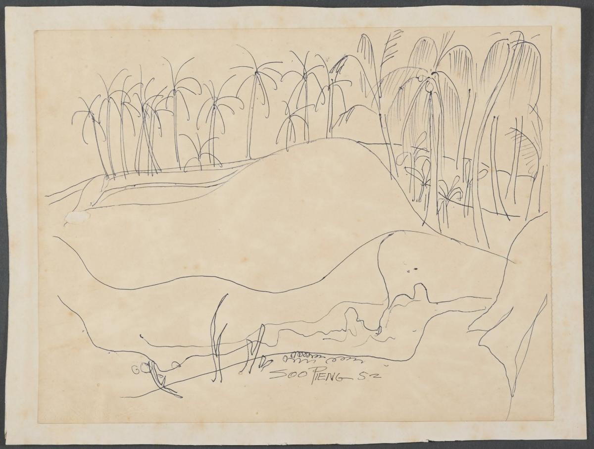 Cheong Soo Pieng, born in Xiamen (Amoy), China in 1914, was accomplished in ink painting having received training in art at Xiamen Academy of Art and Xinhua Academy of Fine Arts in Shanghai. A year after his arrival in Singapore in 1946, he started lecturing at Nanyang Academy of Fine Arts and stayed on till 1961. However it was a trip taken with fellow artists Chen Chong Swee, Chen Wen Hsi and Liu Kang in 1952 to Bali to seek inspiration and seek fresh subject matter that sealed his standing as a pivotal figure in Singapore’s modern art development. He was part of a group of artists that attempted to articulate a style identifiable and pertinent to post-war Singapore, then known collectively with Malaysia, as Malaya. This style, later crystallized as the Nanyang style, provided a foundation upon which future generations of artists learned and expanded on. A key element of the Nanyang style is the synthesis of Chinese pictorial elements and the diverse formalistic qualities from the School of Paris. In 1962, the Singapore government awarded Cheong with the Meritorious Service Medal. He passed away in 1983.‘Untitled (One Coconut Tree by the Beach)’ is a reflection of the ‘localness of the place’, a theme that resonates strongly in Cheong’s art. This is one of countless sketches he made of the landscape of Southeast Asia which collectively provide useful entry points to understand the sources of his iconography.