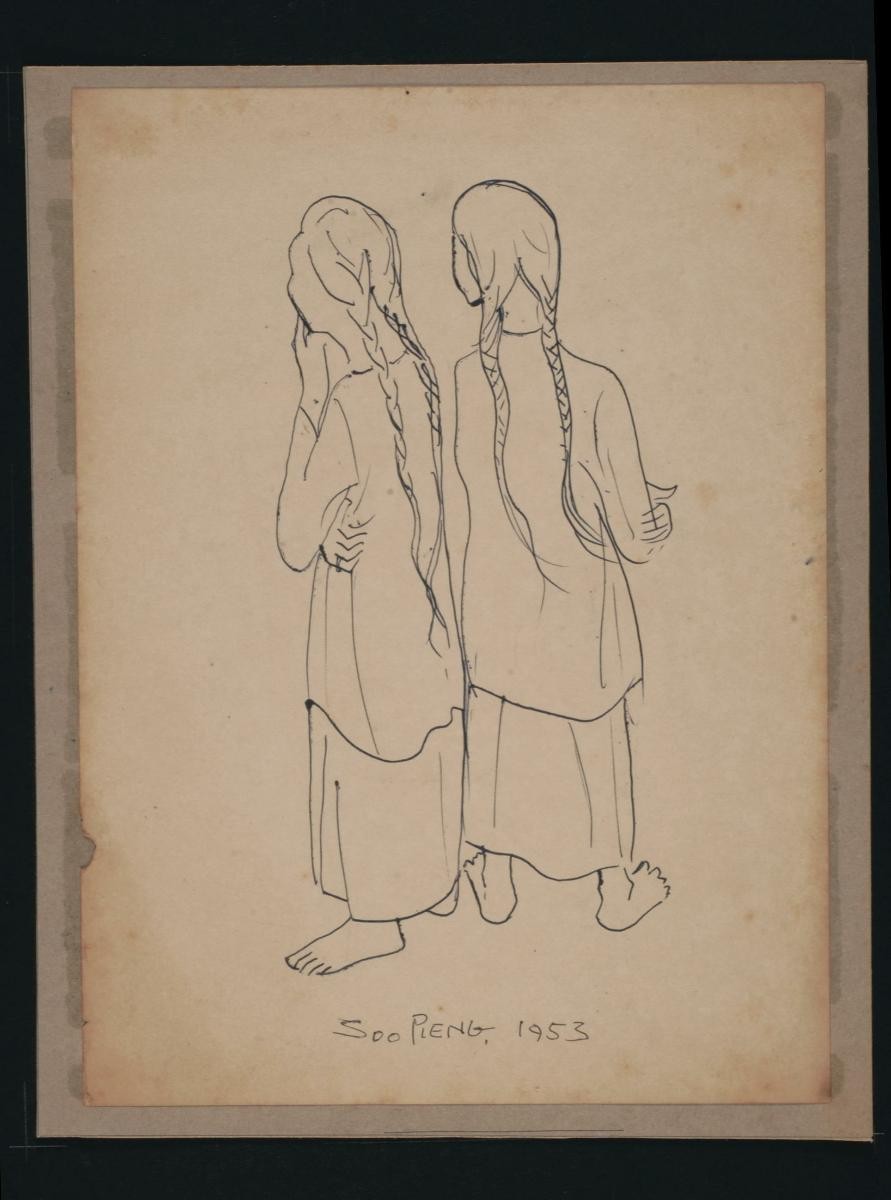 Cheong Soo Pieng, born in Xiamen (Amoy), China in 1914, was accomplished in ink painting having received training in art at Xiamen Academy of Art and Xinhua Academy of Fine Arts in Shanghai. A year after his arrival in Singapore in 1946, he started lecturing at Nanyang Academy of Fine Arts and stayed on till 1961. However it was a trip taken with fellow artists Chen Chong Swee, Chen Wen Hsi and Liu Kang in 1952 to Bali to seek inspiration and seek fresh subject matter that sealed his standing as a pivotal figure in Singapore’s modern art development. He was part of a group of artists that attempted to articulate a style identifiable and pertinent to post-war Singapore, then known collectively with Malaysia, as Malaya. This style, later crystallized as the Nanyang style, provided a foundation upon which future generations of artists learned and expanded on. A key element of the Nanyang style is the synthesis of Chinese pictorial elements and the diverse formalistic qualities from the School of Paris. In 1962, the Singapore government awarded Cheong with the Meritorious Service Medal. He passed away in 1983.An avid traveller and a keen observer, Cheong has produced countless sketches of places, people and their activities. ‘Untitled (Two People Going Home, and Pig)’ was sketched during his trip to Borneo in 1959.