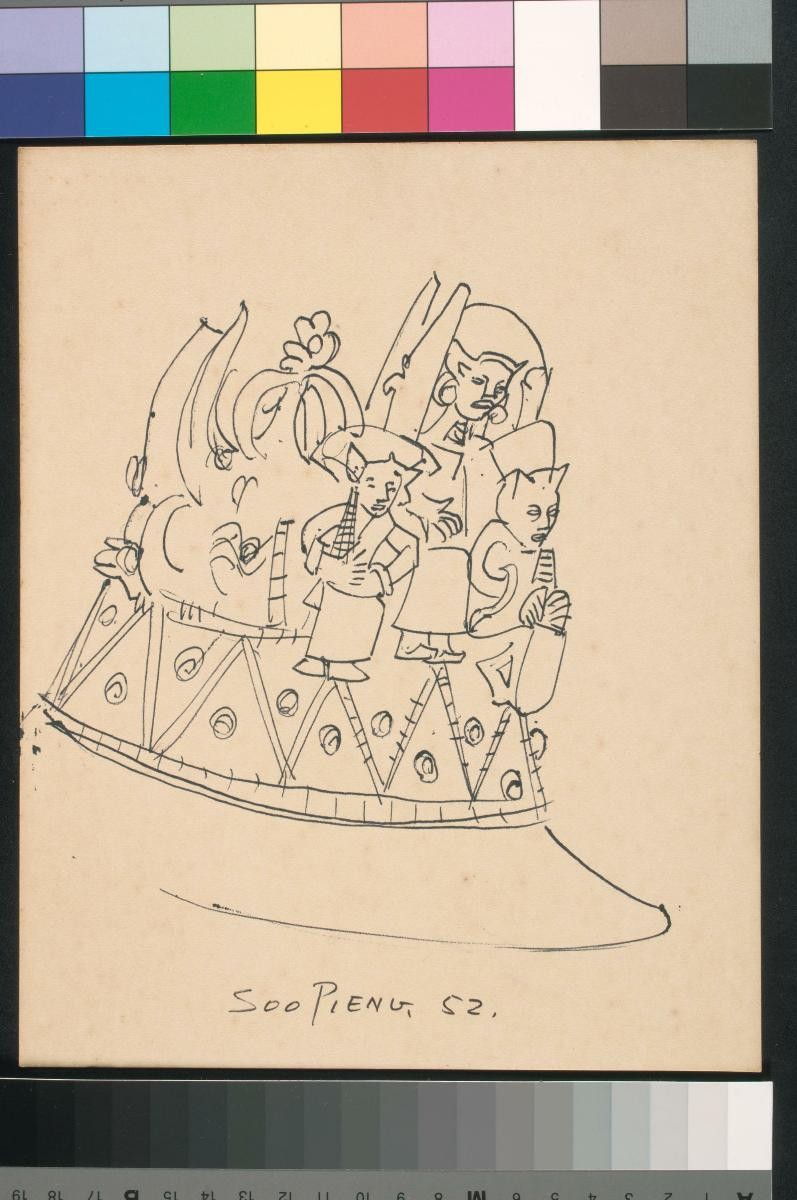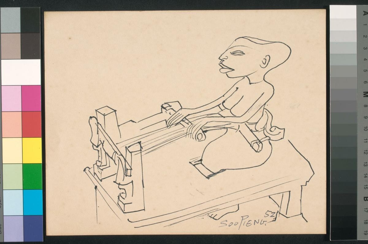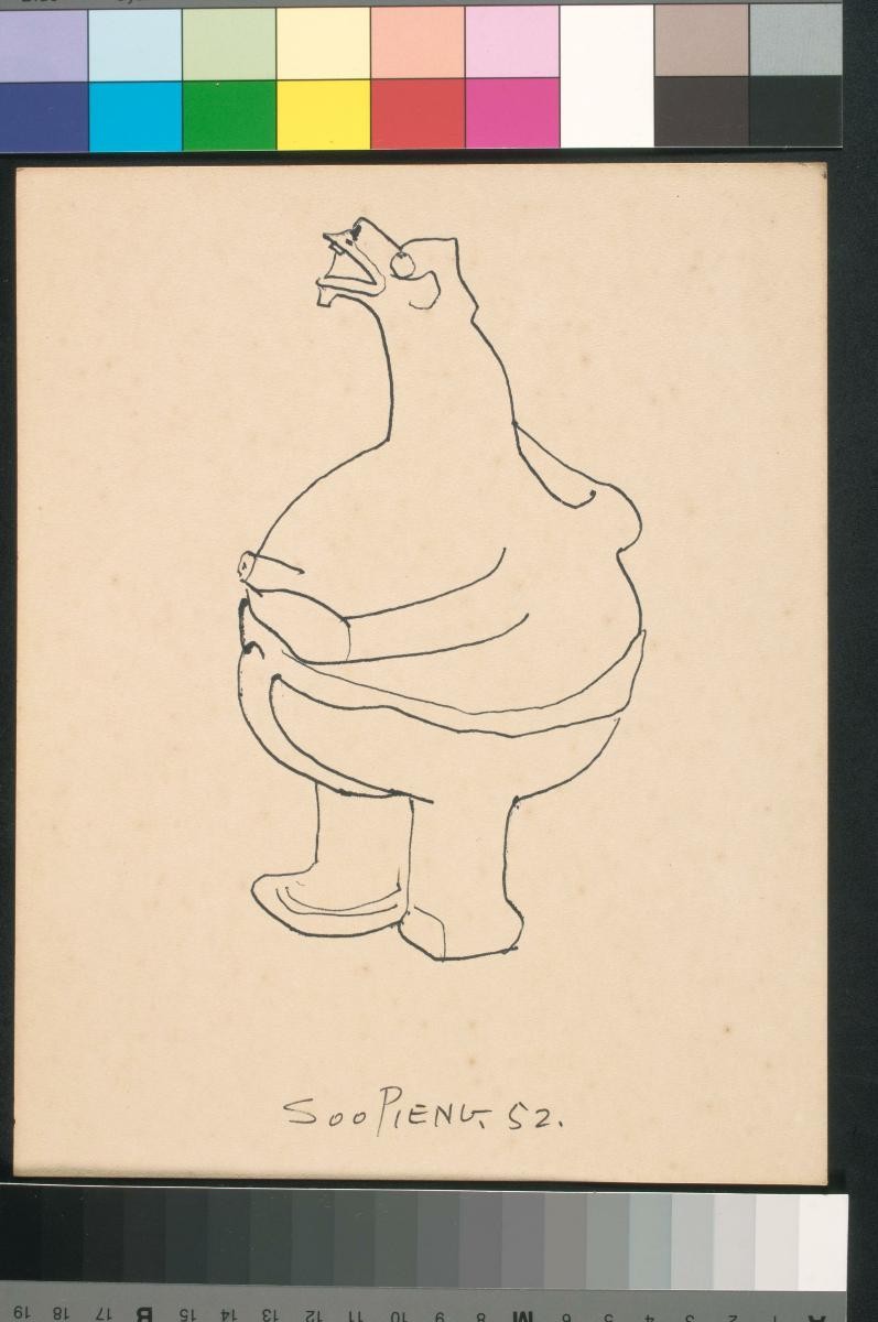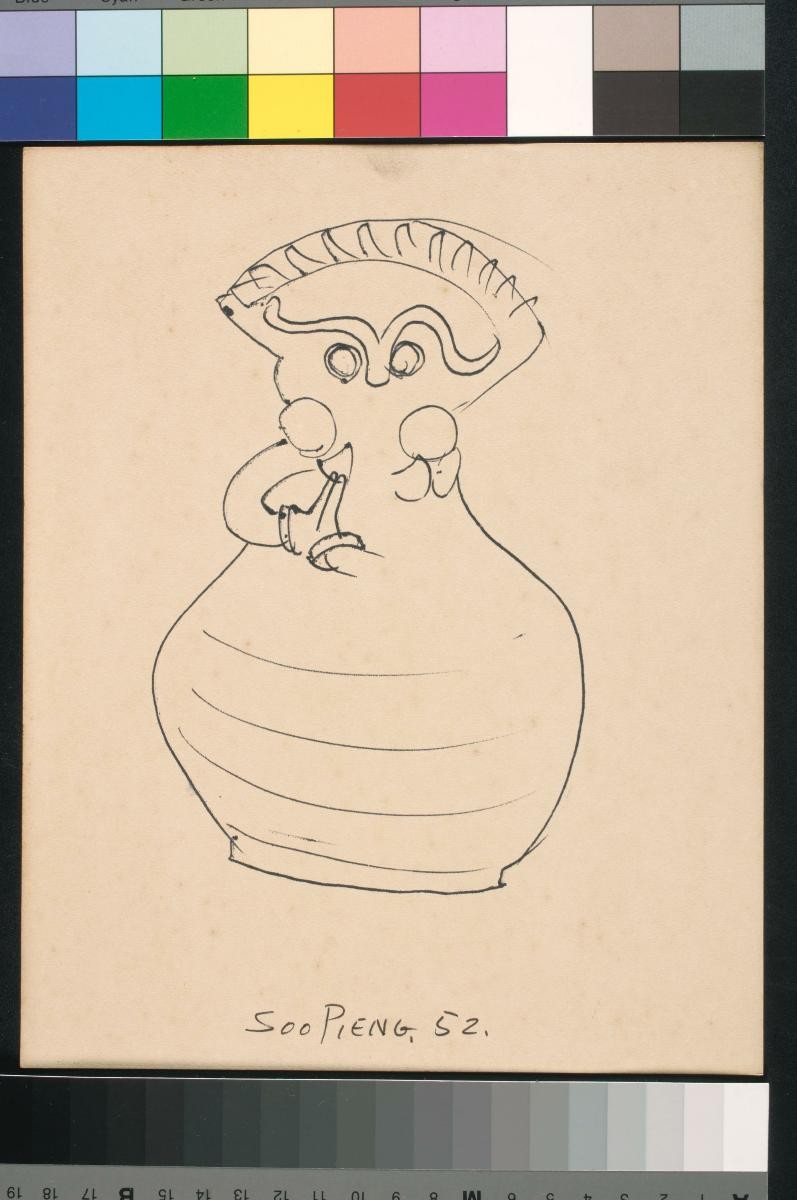 Cheong Soo Pieng, born in Xiamen (Amoy), China in 1914, was accomplished in ink painting having received training in art at Xiamen Academy of Art and Xinhua Academy of Fine Arts in Shanghai. A year after his arrival in Singapore in 1946, he started lecturing at Nanyang Academy of Fine Arts and stayed on till 1961. However it was a trip taken with fellow artists Chen Chong Swee, Chen Wen Hsi and Liu Kang in 1952 to Bali to seek inspiration and seek fresh subject matter that sealed his standing as a pivotal figure in Singapore’s modern art development. He was part of a group of artists that attempted to articulate a style identifiable and pertinent to post-war Singapore, then known collectively with Malaysia, as Malaya. This style, later crystallized as the Nanyang style, provided a foundation upon which future generations of artists learned and expanded on. A key element of the Nanyang style is the synthesis of Chinese pictorial elements and the diverse formalistic qualities from the School of Paris. In 1962, the Singapore government awarded Cheong with the Meritorious Service Medal. He passed away in 1983.Although undated, ‘Untitled (Sketch of Cultural Artefact)’ was probably sketched after Cheong’s 1952 trip to Bali. As a study of basic shapes and angular forms in a figurine, it likely pre-dates Cheong’s experimentation on transforming the figurative form.
