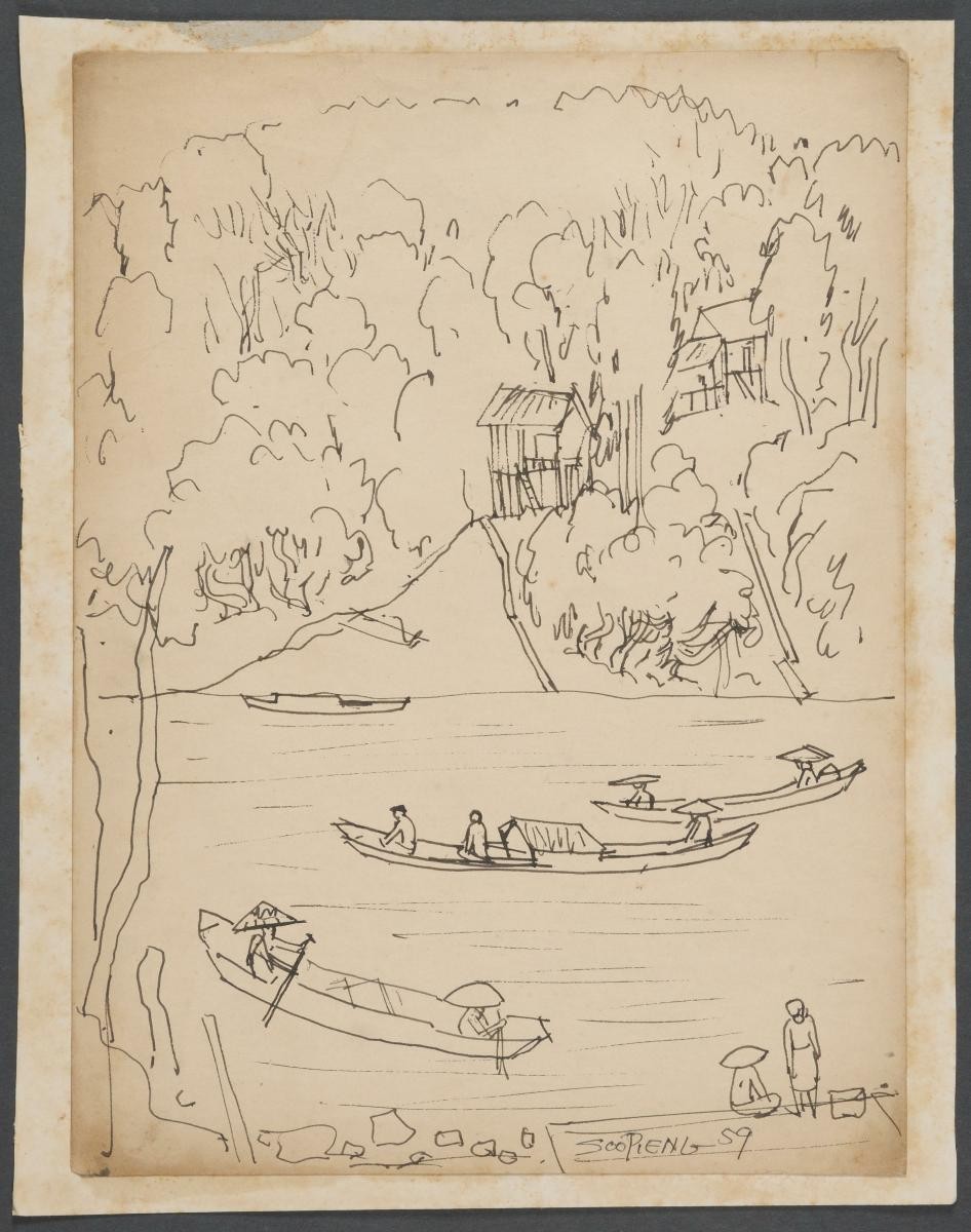 Cheong Soo Pieng, born in Xiamen (Amoy), China in 1914, was accomplished in ink painting having received training in art at Xiamen Academy of Art and Xinhua Academy of Fine Arts in Shanghai. A year after his arrival in Singapore in 1946, he started lecturing at Nanyang Academy of Fine Arts and stayed on till 1961. However it was a trip taken with fellow artists Chen Chong Swee, Chen Wen Hsi and Liu Kang in 1952 to Bali to seek inspiration and seek fresh subject matter that sealed his standing as a pivotal figure in Singapore’s modern art development. He was part of a group of artists that attempted to articulate a style identifiable and pertinent to post-war Singapore, then known collectively with Malaysia, as Malaya. This style, later crystallized as the Nanyang style, provided a foundation upon which future generations of artists learned and expanded on. A key element of the Nanyang style is the synthesis of Chinese pictorial elements and the diverse formalistic qualities from the School of Paris. In 1962, the Singapore government awarded Cheong with the Meritorious Service Medal. He passed away in 1983.‘Untitled (At The Hut with A Birdhouse by The Dock)’ is an example of Cheong’s interest in depicting landscapes that reflect the ‘localness of the place’ and give an insight into the way of life of a community.