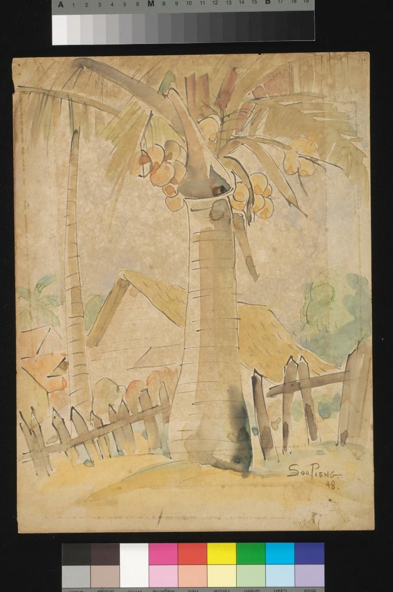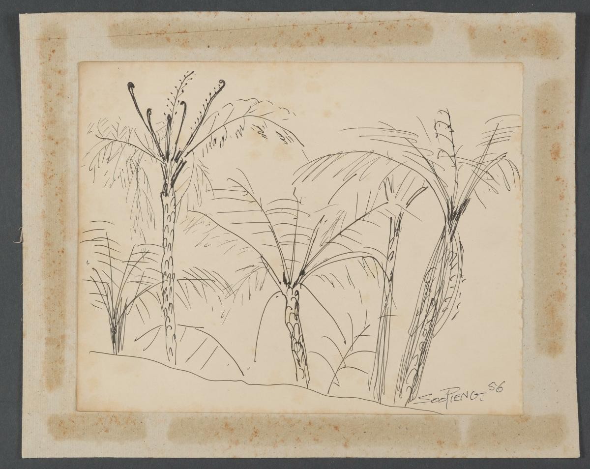 Cheong Soo Pieng, born in Xiamen (Amoy), China in 1914, was accomplished in ink painting having received training in art at Xiamen Academy of Art and Xinhua Academy of Fine Arts in Shanghai. A year after his arrival in Singapore in 1946, he started lecturing at Nanyang Academy of Fine Arts and stayed on till 1961. However it was a trip taken with fellow artists Chen Chong Swee, Chen Wen Hsi and Liu Kang in 1952 to Bali to seek inspiration and seek fresh subject matter that sealed his standing as a pivotal figure in Singapore’s modern art development. He was part of a group of artists that attempted to articulate a style identifiable and pertinent to post-war Singapore, then known collectively with Malaysia, as Malaya. This style, later crystallized as the Nanyang style, provided a foundation upon which future generations of artists learned and expanded on. A key element of the Nanyang style is the synthesis of Chinese pictorial elements and the diverse formalistic qualities from the School of Paris. In 1962, the Singapore government awarded Cheong with the Meritorious Service Medal. He passed away in 1983.Like his fellow artists, Cheong looked to his surroundings for inspiration and subject matter for his art. ‘Untitled (Village with Coconut Trees)’ is an example of his scrutiny and interest in the people and landscape of Southeast Asia.
